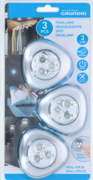 - Ви потрібно додаткове освітлення в певних місцях, але поблизу немає електричної розетки? Ці світлодіодні прожектори від Grundig — ідеальне рішення! Лампи тиску доступні в наборі з 3 і працюють окремо від 3 батарейок ААА (не входять в комплект)