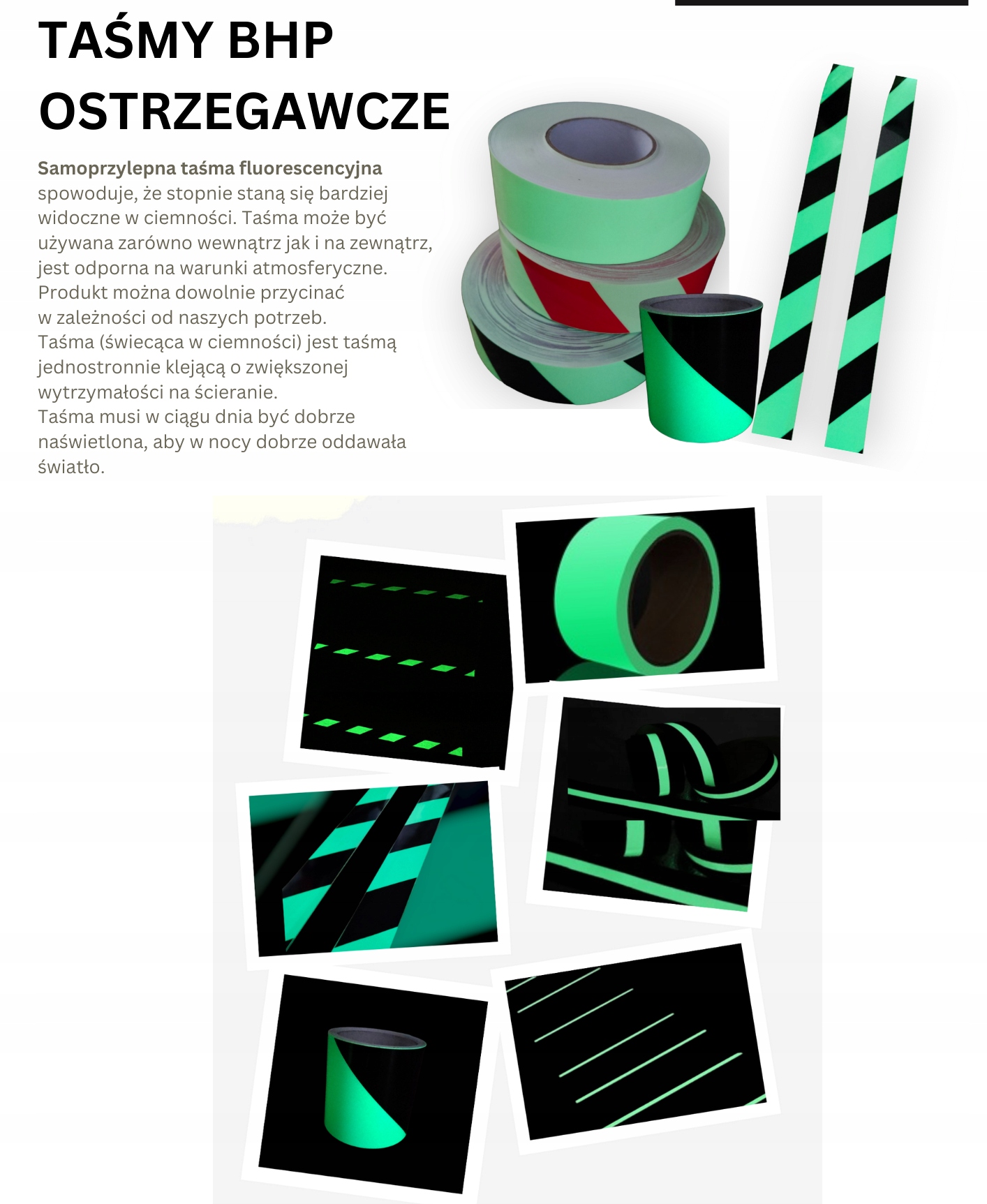 Односторонні клейкі фотолюмінесцентні стрічки з ПВХ плівки. Вони покращують видимість електричних вимикачів, замків, розеток і поручнів у темряві.
