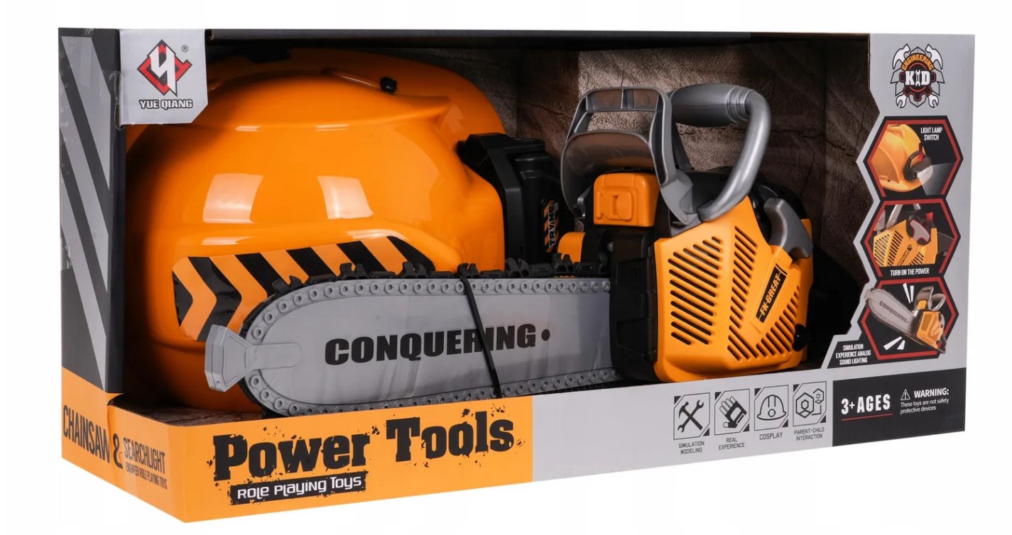 Інтерактивний набір бензопили зі звуковими ефектами і шоломом з ліхтариком призначений для дітей від 3 років. Пила абсолютно безпечна для дітей. Він виготовлений з якісного пластику і не має гострих країв. Ланцюг виготовлений з гуми. Щоб запустити пилку, потягніть за шнур стартера, і ви почуєте звук запуску двигуна. Щоб увімкнути ланцюг, натисніть і утримуйте нижню кнопку на ручці. Ланцюг почне обертатися та видаватиме ріжучий звук. У комплект входить шолом з регульованою лампою і підборідний ремінь. Пила живиться від батарейок 3 x AAA 1,5 В, батарейки в комплект не входять. Шолом живиться від 3 батарейок AG13, які входять у комплект.