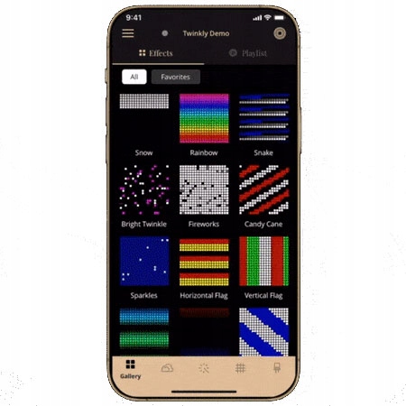 Програма Twinkly App дозволяє створювати унікальні світлові декорації завдяки широкому спектру готових ефектів і анімації, а також можливості створювати власні з нуля. Усі ефекти можна повністю налаштувати: яскравість, швидкість, інтенсивність і колір можна змінювати лише одним дотиком, що дає вам безмежні можливості для створення ідеальних світлових декорацій.