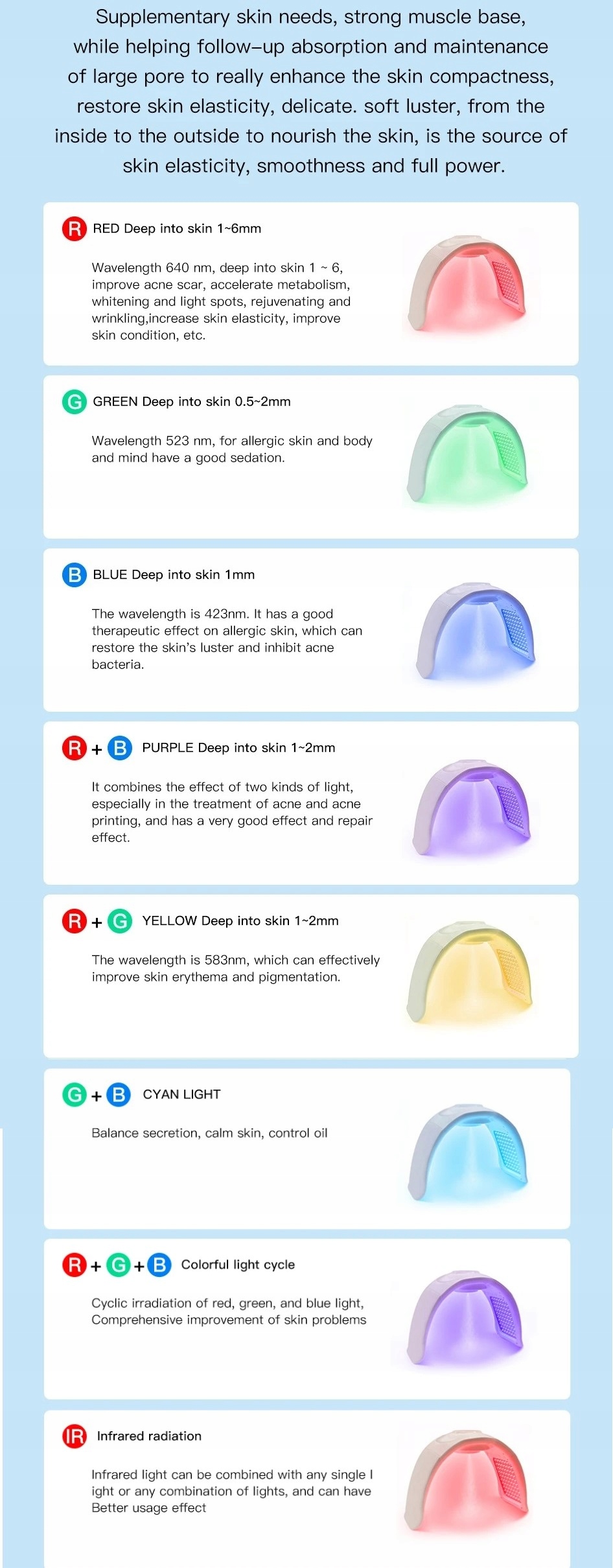 Цей пристрій використовує різні кольори світлодіодного світла, які кожен має свій специфічний вплив на шкіру: