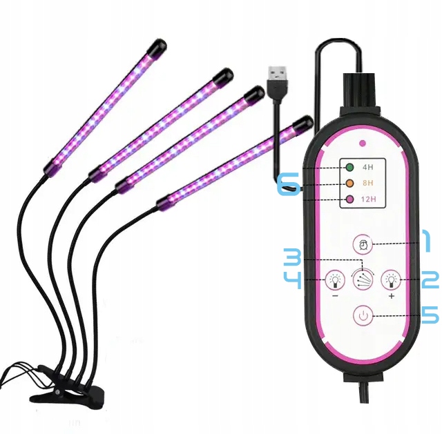 Світлодіодна лампа для росту рослин, таймер, USB-затискач, рухомий 4 головки