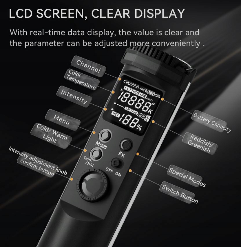 Ергономічний дизайн панелі керування на основі чіткого РК-екрану , кнопки та спеціальна ручка дозволяє швидко та зручно змінювати налаштування світла. У комплекті з лампою є спеціальний монтажний кронштейн із різьбою 1/4 дюйма. Прозорий затискач забезпечує зручне встановлення без ризику закриття будь-якої частини світлової труби. Ручка оснащена шарніром, який дозволяє щоб нахилити лампу та точно налаштувати її положення відповідно до ваших поточних потреб.