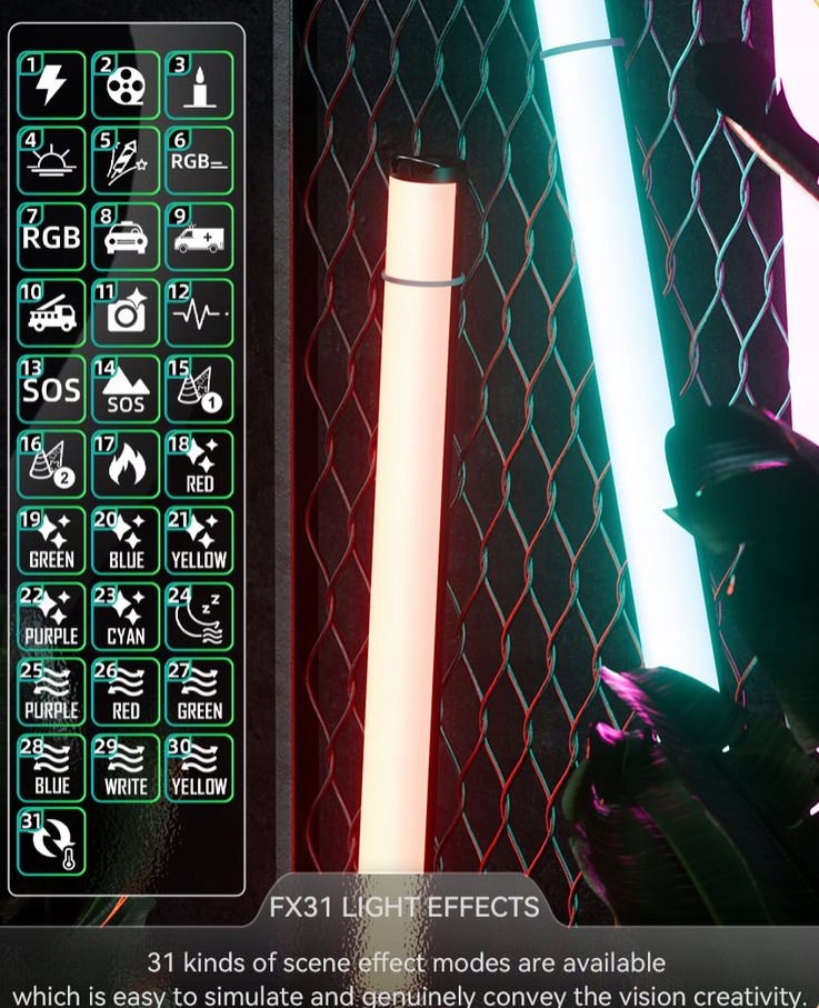 Ваші відеоматеріали можна збагатити унікальними спецефекти. Серед 31 унікальної комбінації спалахів і змін кольору ви знайдете, серед іншого: такі симуляції, як: швидка допомога, феєрверк, схід сонця, гроза, свічки, вечірка, вогонь, стробоскоп, пожежна машина, світіння кінопроектора та багато інших. Спецефекти можна активувати як з контролера, розміщеного на лампі, так і з безкоштовного мобільного додатку YONGNUO, який можна знайти в Google Play і App Store.