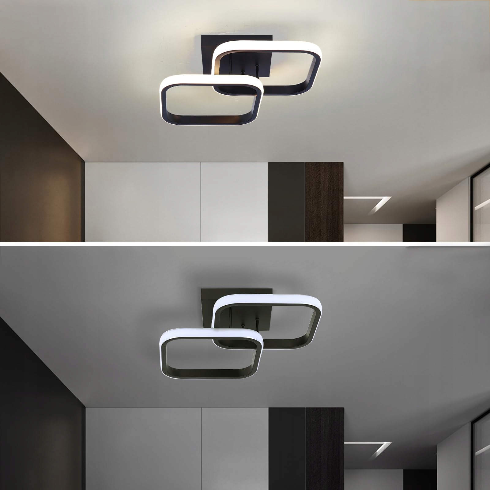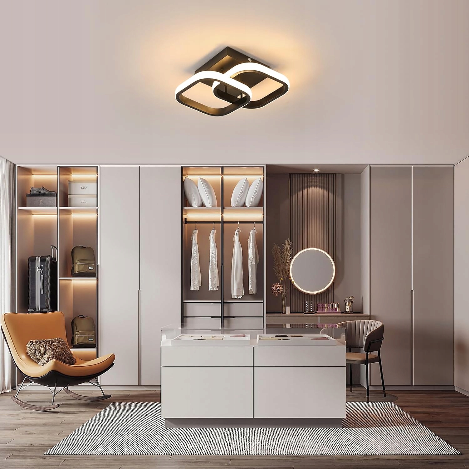 Ця сучасна світлодіодна стельова лампа є чорною і складається з двох ріжучих квадратних світильників, що надає йому тривимірний, геометричний вигляд. Стельові світильники для інтер’єру мають стабільний і рівномірний джерело світла та простий і елегантний вигляд. Вони ідеально підходять для балконів, коридорів, кухні, комунальних кімнат, підвалів та дитячих кімнат.