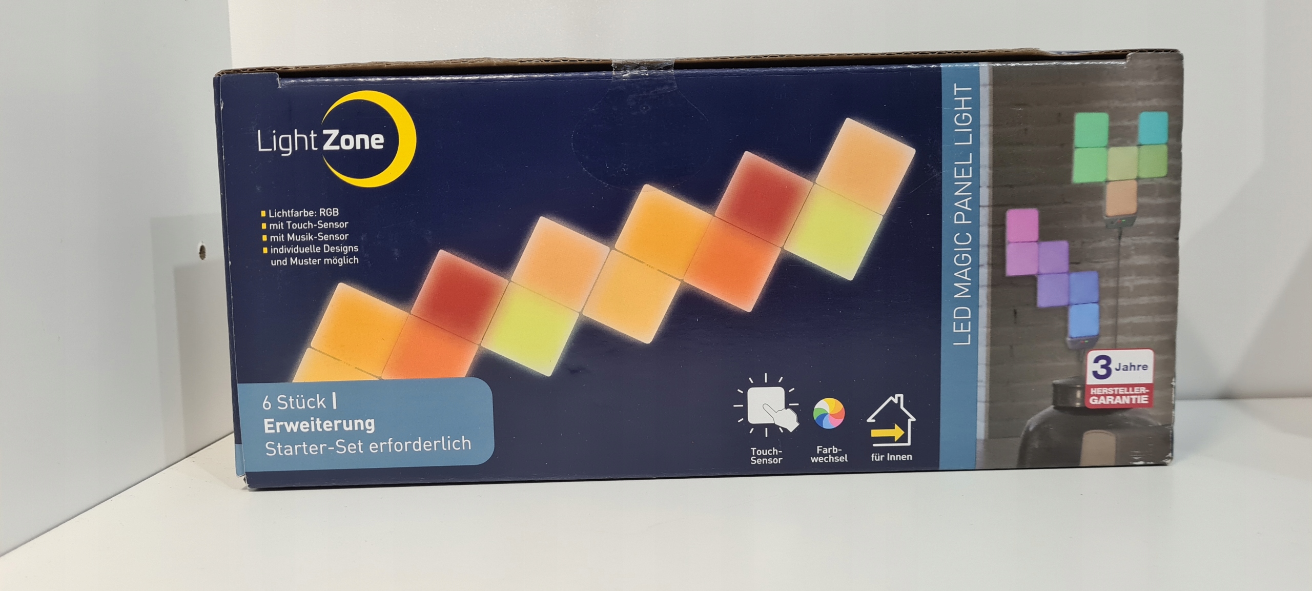 Для приміщень; Набір складається з 6 панелей, ширина × довжина: кожна приблизно 10 × 10 см, 6 × приблизно 25 м, 6 × приблизно 1,8 Вт; з датчиком дотику, музичним датчиком і кольором; індивідуально підключені; з можливістю розширення до максимум 12 частин на блок живлення