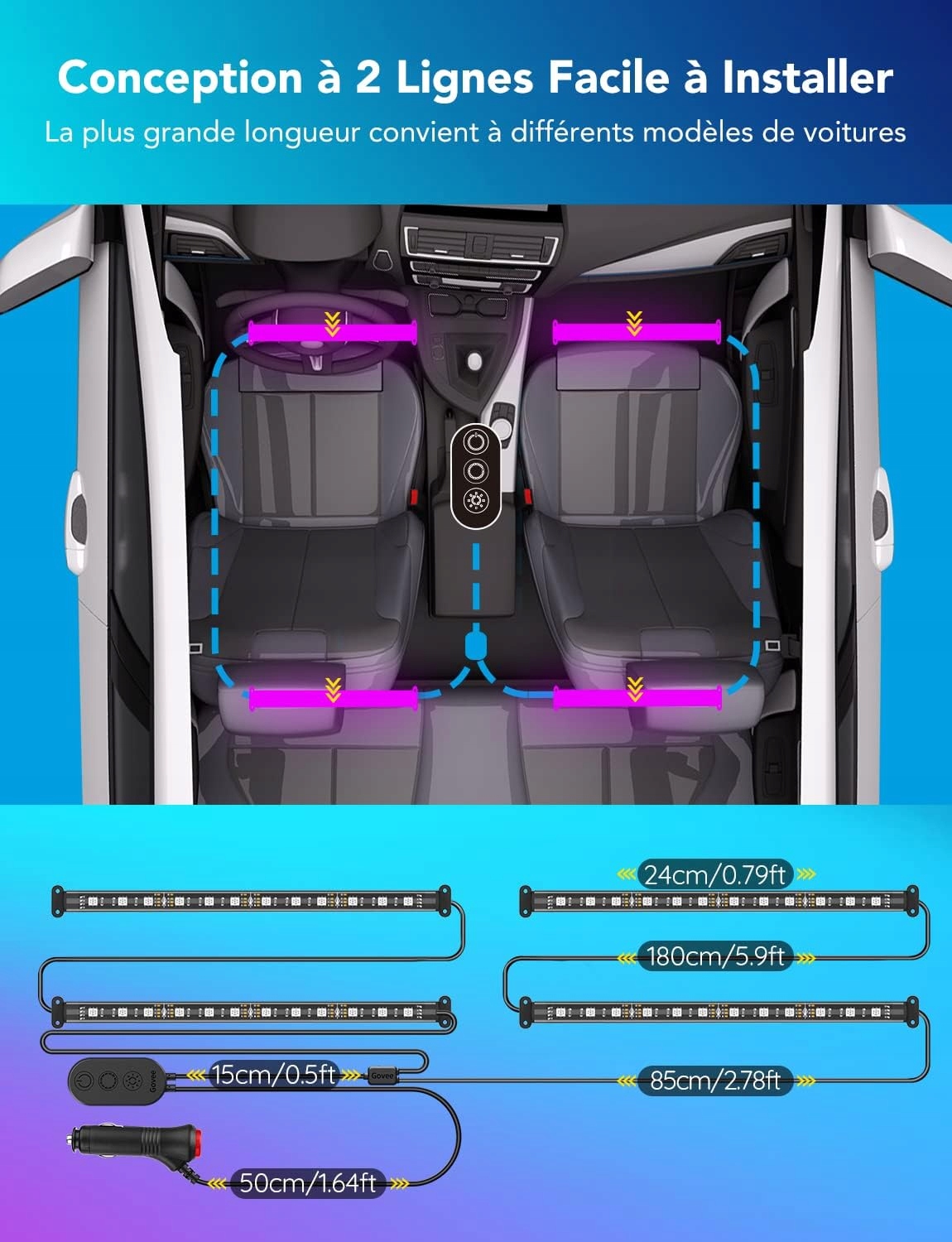 Автомобільні світлодіодні стрічки мають робочу напругу 12 В, живляться від автомобільного зарядного пристрою, оснащені захистом від короткого замикання та функцією пам’яті. Водонепроникний, надзвичайно термостійкий, зручний для дотику та безпечний для дітей.