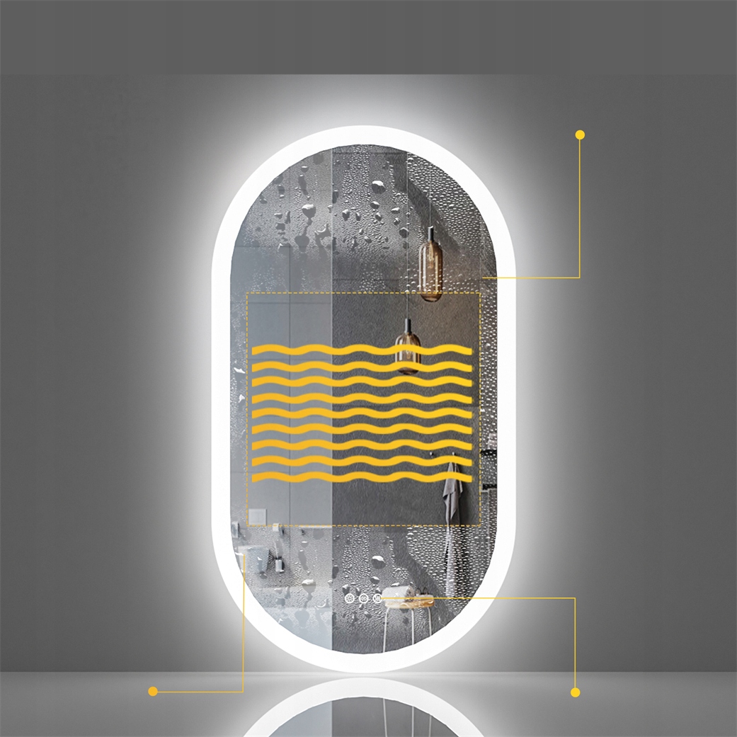 Унікальне овальне настінне дзеркало, вдосконалює естетику ванної кімнати, HD дзеркало, виготовлене з сильного алюмінієвого сплаву для високої міцності та стабільності, всі електронні компоненти відповідно до UL. IP56 Оцінка водостійкості, забезпечує час використання приблизно 50 000 годин.