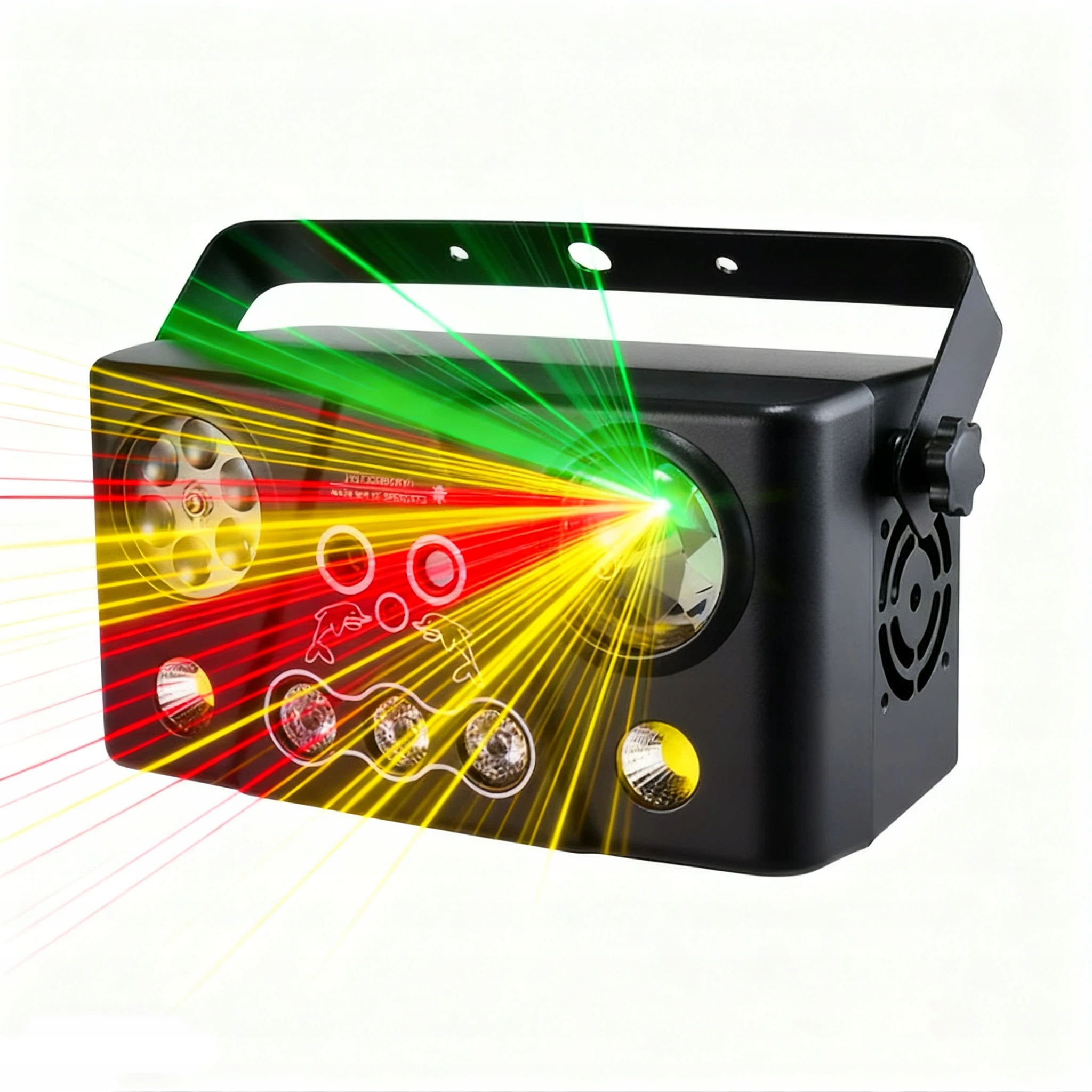Джерело світла: 6 світлодіодів RGB 3 Вт, 3 світлодіоди RGB 3 Вт, 1 червоний лазер 100 мВт + 1 зелений лазер 40 мВт + 2 Білі стробоскопи потужністю 10 Вт
