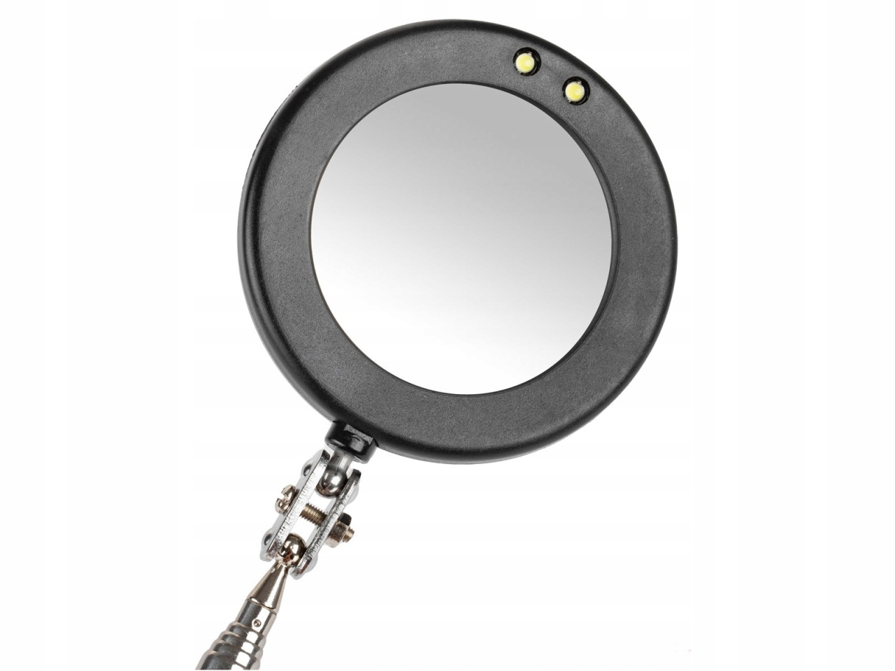 Оглядове дзеркало на телескопічній стрілі, оснащене двома світлодіодами підсвічування. Продукт необхідний в кожній автомайстерні. Дозволяє розглядати недоступні, приховані елементи конструкції автомобілів, машин і т. д. Дзеркало має регулювання положення на 360° відносно стріли. Ідеально підходить як для професійного використання, так і для домашнього гаража.