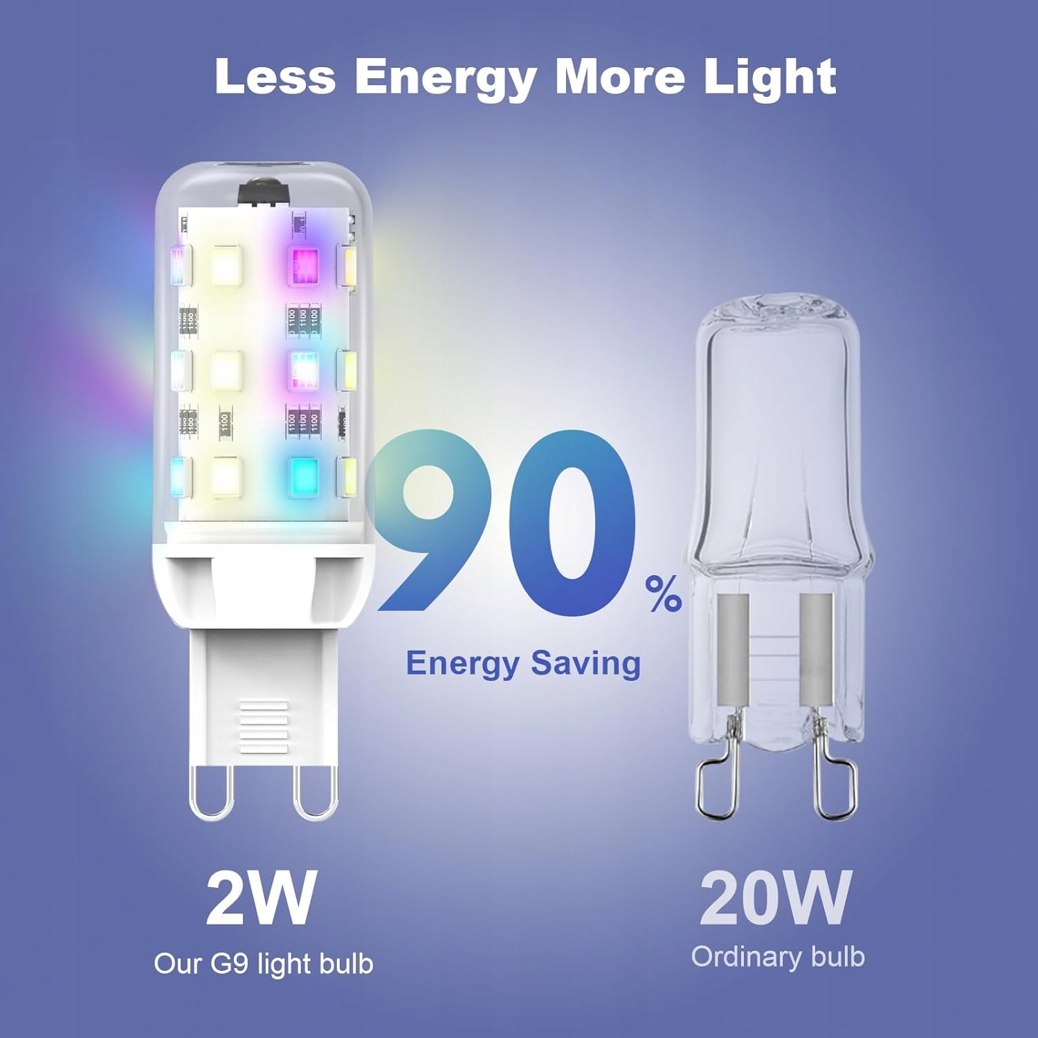 - випромінює яскравість 420 люмен завдяки інтелектуальному світлодіодному G9 лампочці лише 2 Вт, еквівалента цибулини галогену 20-40 Вт, заощаджуючи до 90% енергії. Кут освітлення 360 градусів забезпечує хороший розподіл світла.