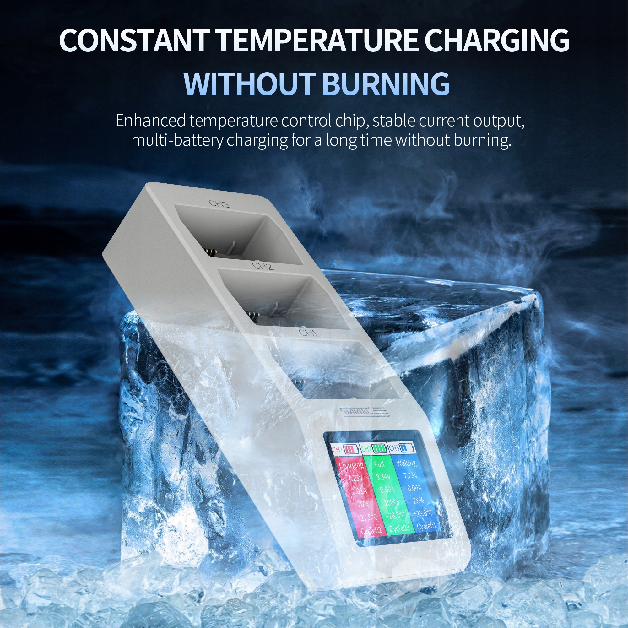 【Зарядний пристрій для РК-дисплея】Автоматичне визначення, пріоритетне заряджання акумуляторів великої ємності; Екран зарядного центру відображатиме напругу, струм, рівень заряду акумулятора та температуру заряджання акумулятора.