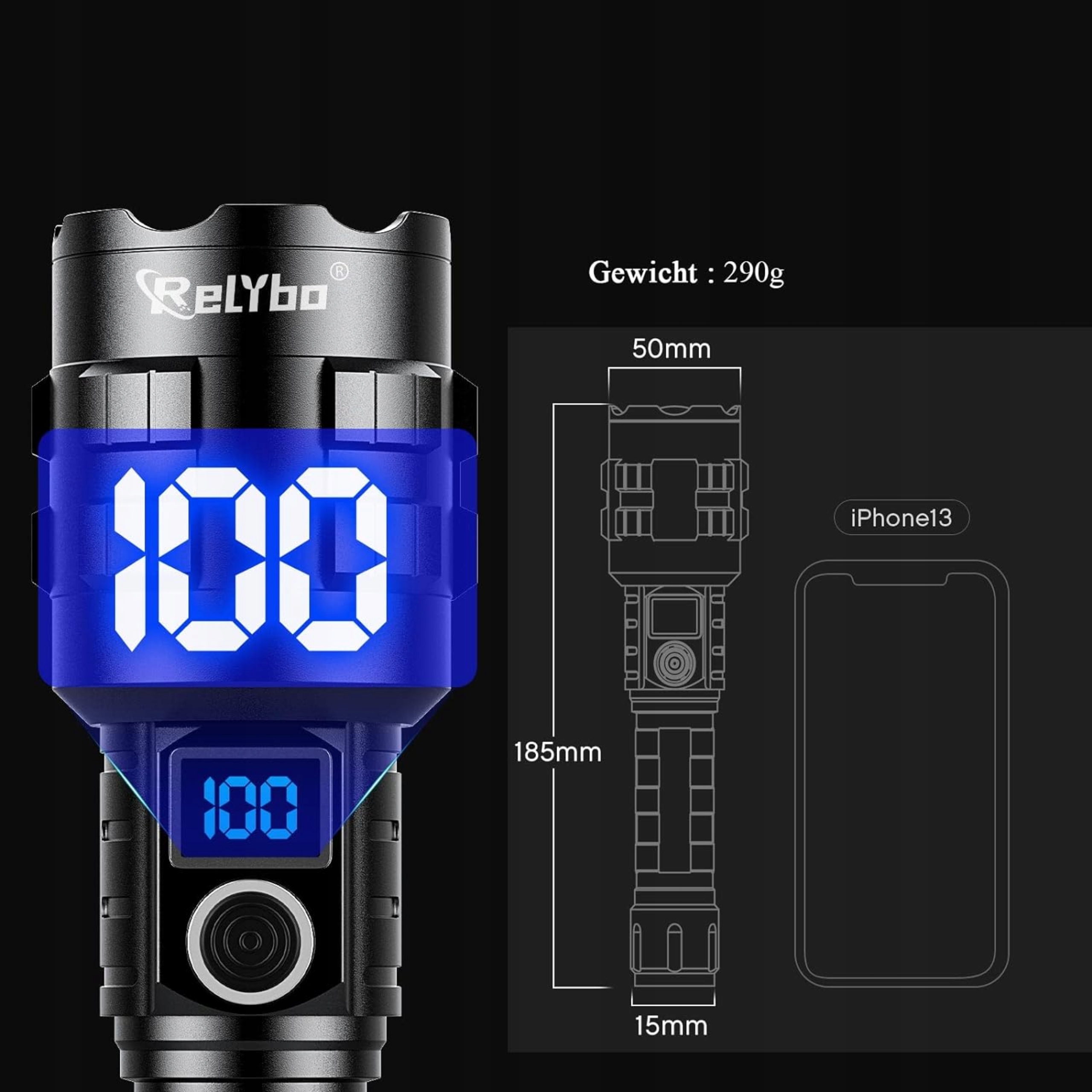 ✔️ Світлодіодний ліхтарик Relybo використовує ексклюзивний 4-ядерний світлодіодний чіп XHP90, який генерує 20 000 люменів світла, забезпечуючи неперевершену яскравість професійного рівня.