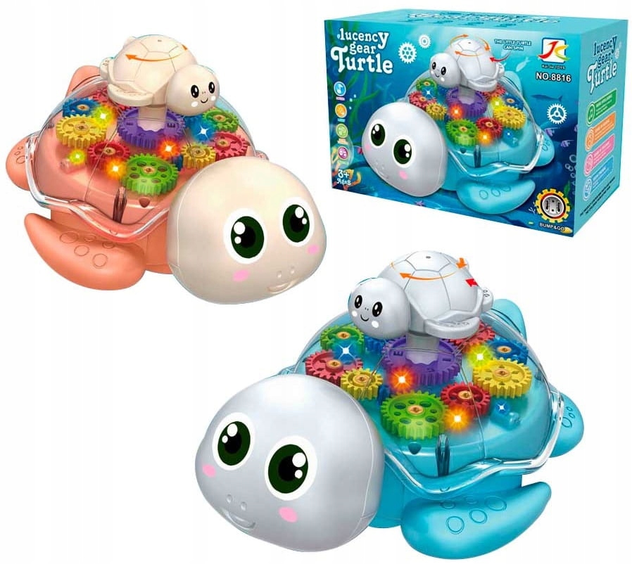 - Весела черепаха має прозорий панцир із різнокольоровими шестерінками всередині — під час гри коліщатка крутяться, а всередині черепашки виблискують різнокольорові вогники