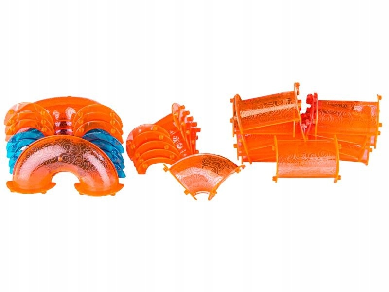- Набір складається з багатьох різнокольорових частин і дозволяє побудувати доріжку для м’яча будь-якої компоновки.
