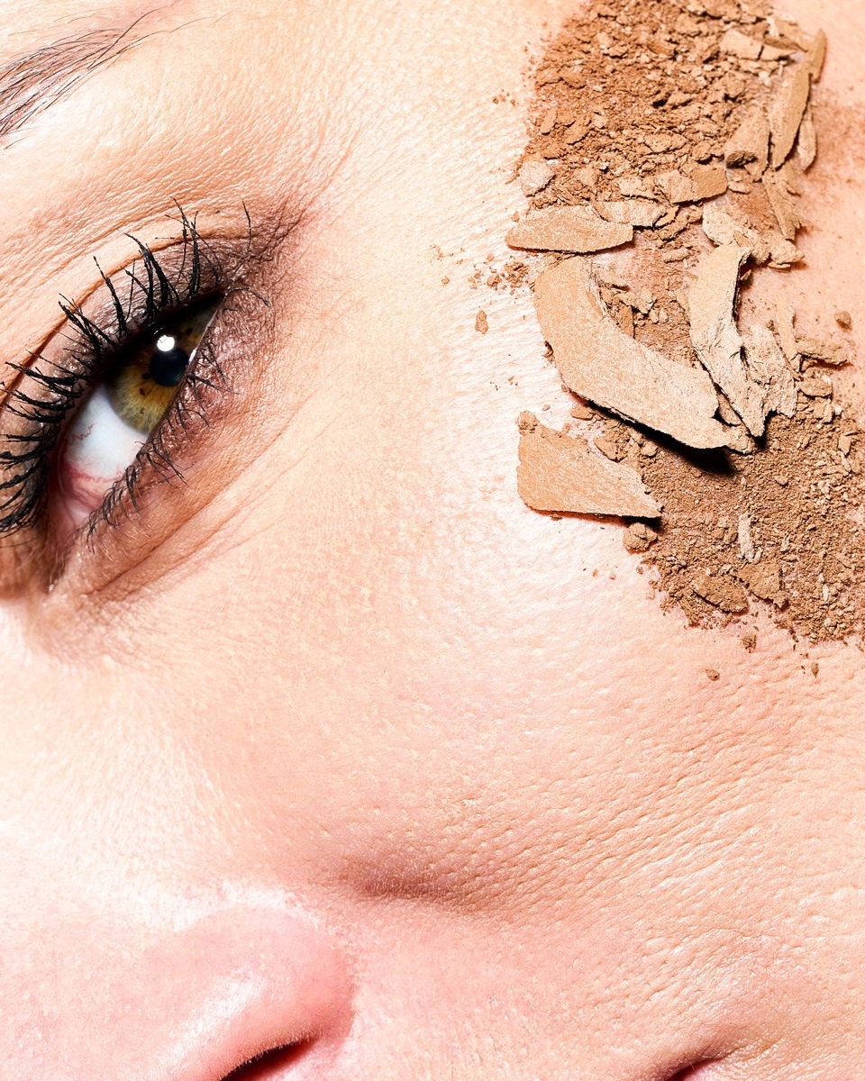 5 – Обличчя вже підрум’янилося, а його риси загострилися. Щоб завершити макіяж, нанесіть бронзатор на повіки: за допомогою більшого розтушовувального пензля нанесіть на верхню повіку та нанесіть хмару кольору на зовнішній кут і область над складкою.