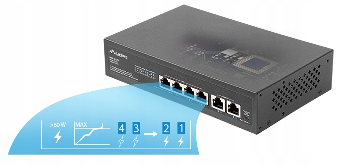 На додаток до оригінальної функції комутатора, тобто обробки трафіку кадрів Ethernet між портами, він також забезпечує живлення кожного пристрою в стандарті PoE/PoE+ - 802.3af і в. Це дозволяє живити пристрої сумарною потужністю до 60 Вт. Усе це разом із одночасною передачею даних на них.