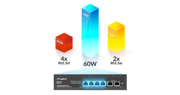 - 4 пристрої за стандартом IEEE 802.3af (макс. 15 Вт на порт) або,