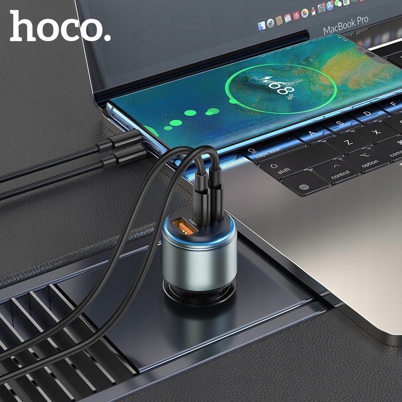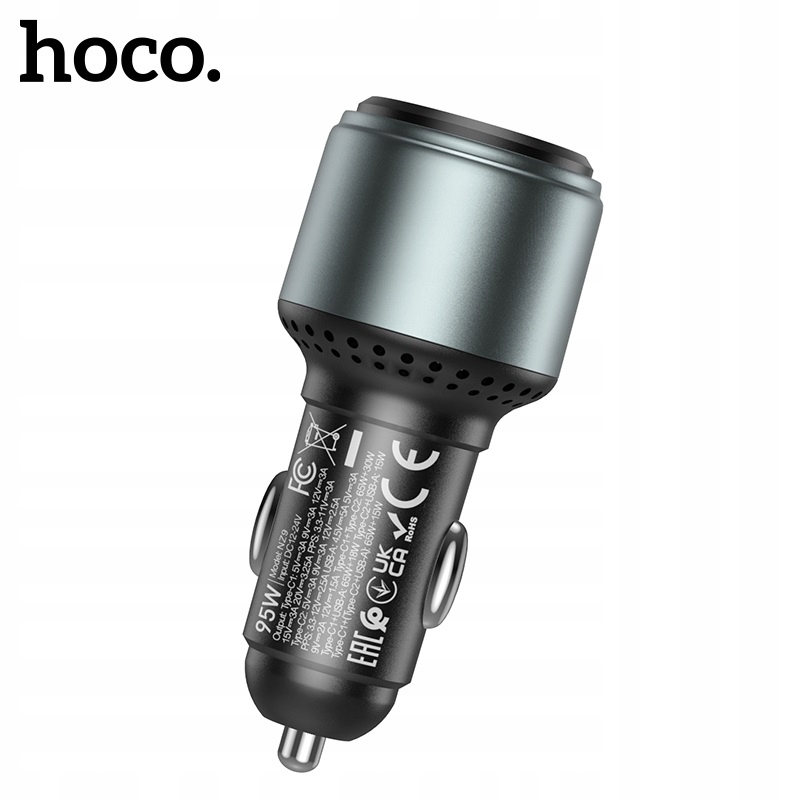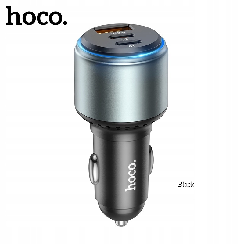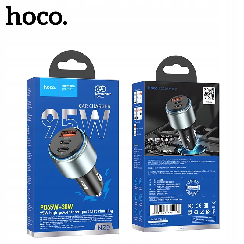 hoco NZ9 Galloperє мінімалістичний за своїми розмірами, автомобільний зарядний пристрій з трьома USB-портами, одним QC3.0 / Quick Charge 3.0 типу USB-A розеткою потужністю 18 Вт, другим USB Type-C / USB C Power Delivery PD потужністю 30 Вт, підтримує такі стандарти швидкої зарядки, як PD2.0 / 3.0, PPS, iPhone PD20W, QC3.0 / QC2.0 / Huawei FCP / SCP або Samsung AFC і третій порт USB Type-C / USB C Power Delivery PD з потужністю 65 Вт, підтримує стандарти швидкої зарядки, такі як PD2 .0 / 3.0, PPS, iPhone PD20W, QC3.0 / QC2.0 / Huawei FCP / SCP або Samsung AFC. Зарядний пристрій додатково має всі засоби захисту від струму та перенапруги та сертифікати, що дозволяють продаж та використання в Європейському Союзі. У комплект входить кабель USB Type-C / Type C / Type C / USB-C PD довжиною 1 м / 100 см. Його також можна використовувати для заряджання мобільних комп’ютерів, таких як ноутбуки/ноутбуки чи планшети.