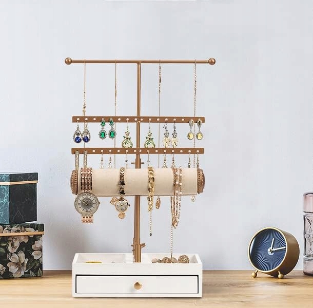 - ✅【Багатофункціональна підставка для прикрас】: 3 різні типи полюса Т-подібної форми можна розташувати за бажанням, підходить для підвішування намиста, сережок, сережок, годинників, браслетів; дерев'яна основа на висувних ящиках включає в себе іншу чашу для зберігання аксесуарів і ящики. Може зберігати цінні предмети. Ви можете легко отримати те, що вам потрібно, не знімаючи з вітрини всі намиста.