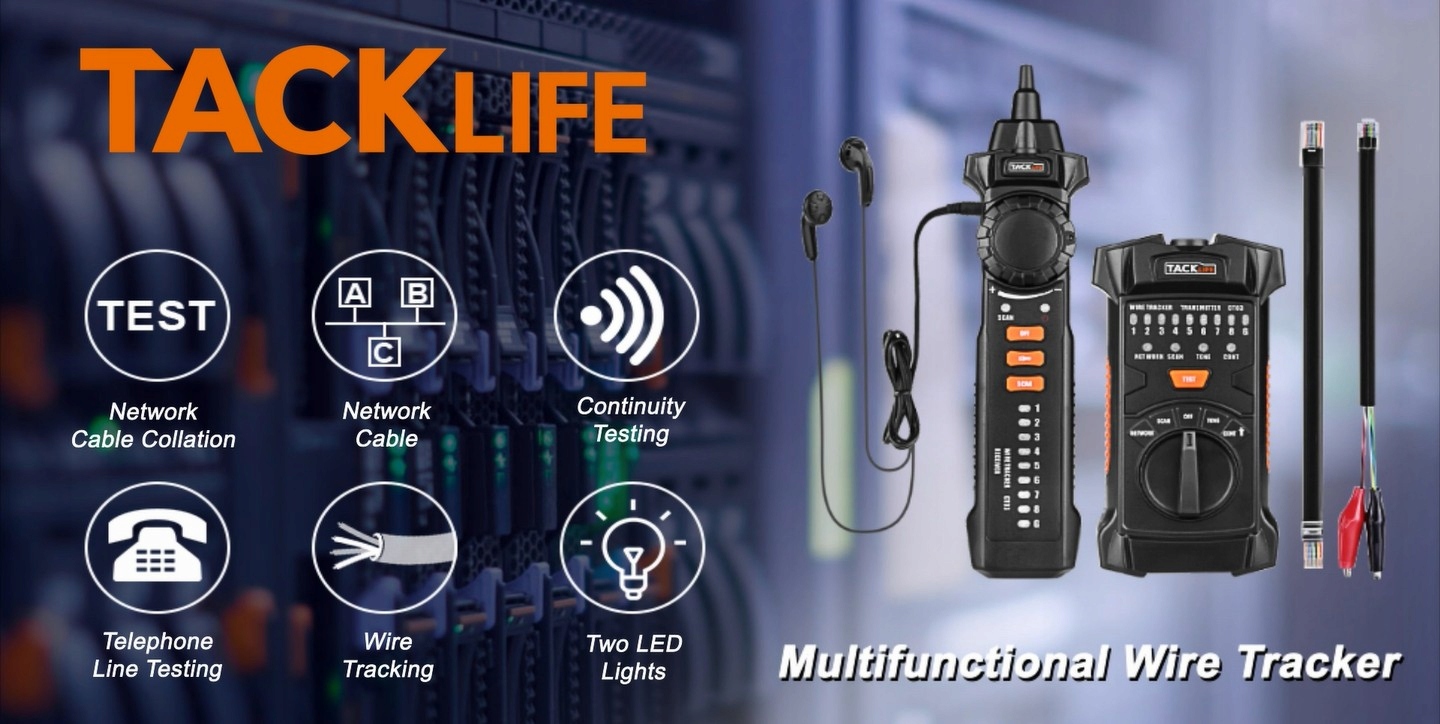 Tacklife CT03 Line Finder перевіряє фізичний стан з’єднань мережевого кабелю, наприклад: переривання, коротке замикання, помилки з’єднання або зміна полярності; За допомогою передавача можна перевірити робочий стан телефонних ліній (наприклад, оцінка лінії TIP або RING), перевірити рівень лінії та визначити позитивну та негативну полярність; Гучність приймача регулюється поворотом ручки гучності.