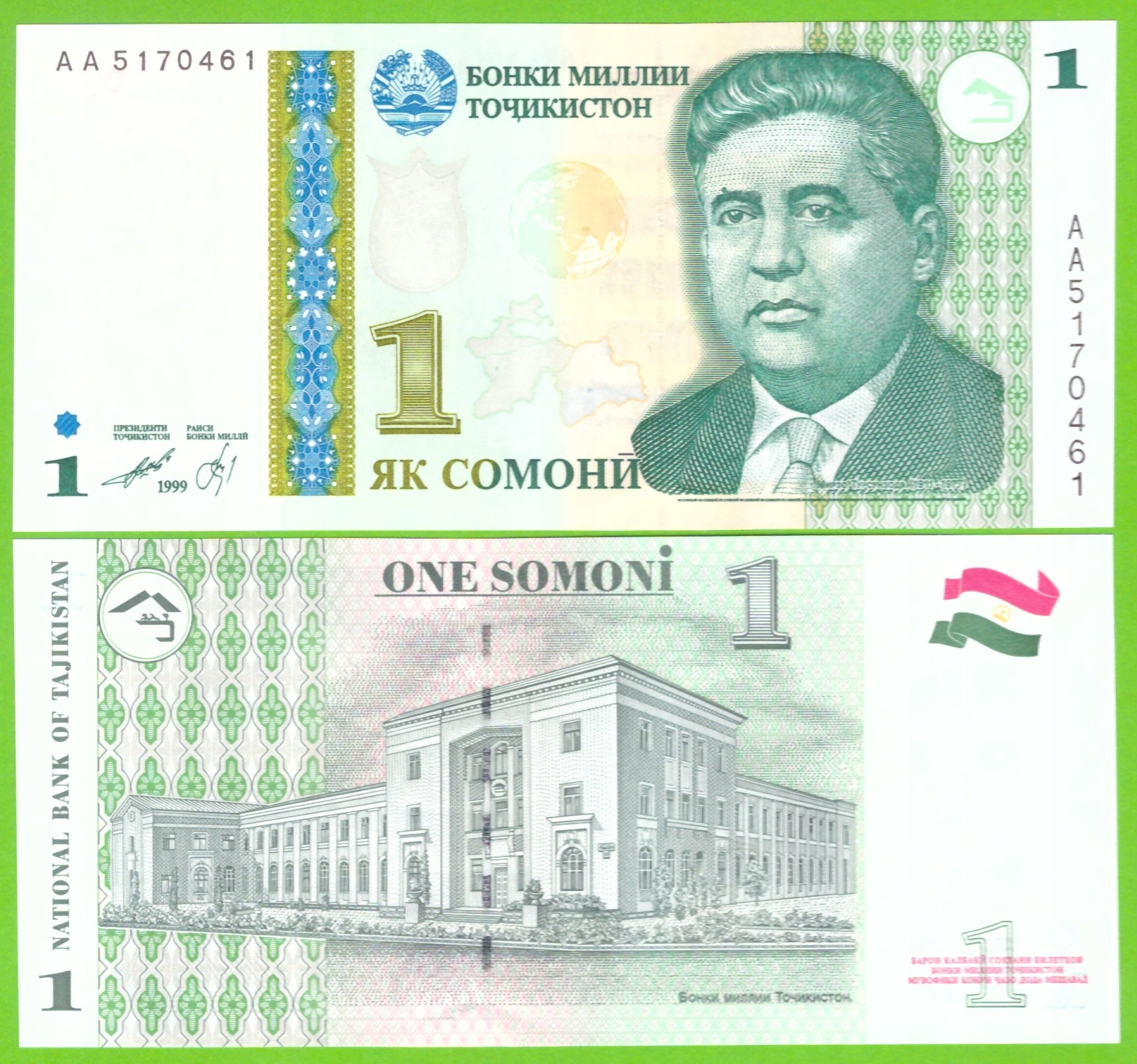ТАДЖИКИСТАН 1 СОМОНІ 1999 P-14a UNC СЕРІЇ AA СВІТЛО-ЗЕЛЕНИЙ ГЛОБ РІДКІСЬКИЙ