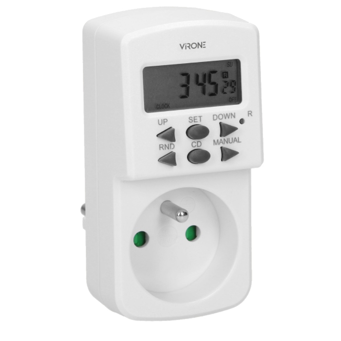 Електронний програматор VIRONE DT-2 має РК-дисплей для встановлення часу ввімкнення та вимкнення електроприладів у певний період часу (наприклад, освітлення, водонагрівач). , реклама тощо). Його можна запрограмувати на щоденний або тижневий цикл або вибрати функцію ВИПАДКОВОГО.