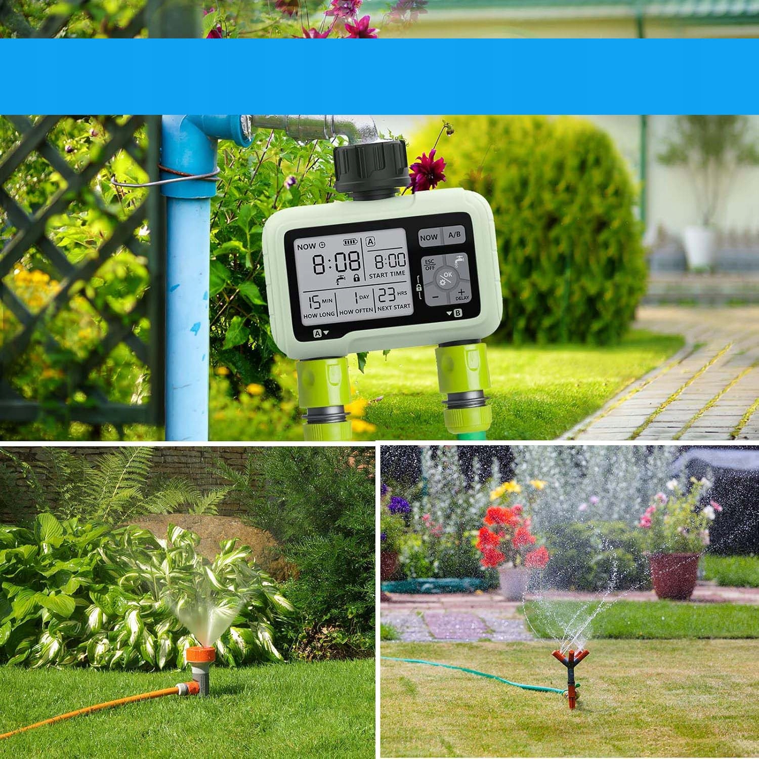 💧💧2 незалежні області зрошення та латунний інтерфейс - Ця нещодавно модернізована зрошувальна система оснащена двома незалежними клапанами, тому ви можете легко встановити свій план зрошення та ідеально виконувати функцію подвійного використання однієї машини. Нещодавно вдосконалений інтерфейс жовтого мідного матеріалу, сильніша, більша резистентність до корозії.