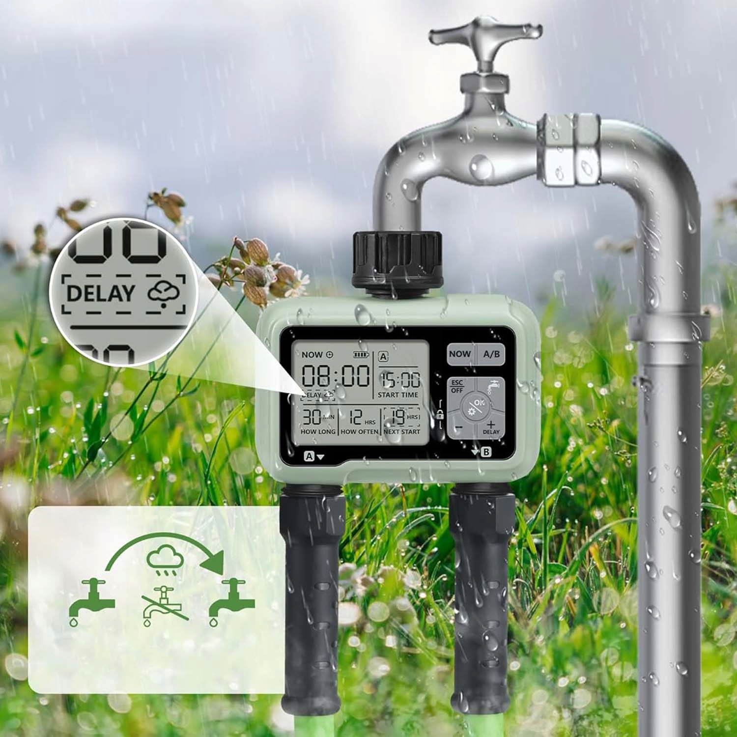 💧💧 💧💧 Функція буріння затримки дощу - Цей новий, вдосконалений цифровий садовий годинник на рік має функцію ручної затримки дощу. Застосовуйте гнучко в сезон дощів, щоб затримати встановлений графік зрошення, щоб запобігти переповненню та підтримувати здорову галявину та рослини, а також заощадити час та зусилля, змінюючи графік зрошення вручну.