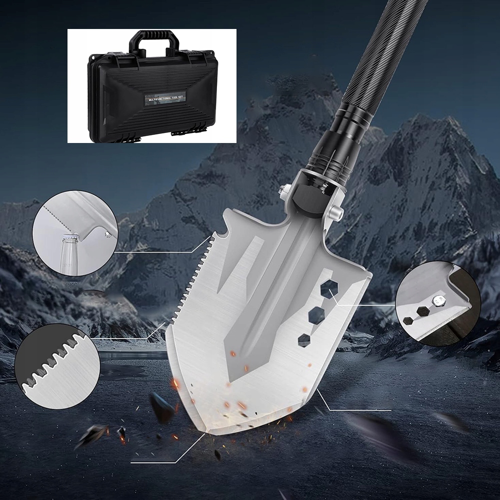 Składana łopata z siekierą składa się z łopaty, siekiery, przedłużonego trzonka I innych akcesoriów. Залежно від зростання та умов використання, ви можете відрегулювати лопату виживання складання на різну довжину. Лопас і сокира від'єднані та прості в встановленні. Набір легкий і простий у перенесенні. Підходить для кемпінгу, пригод, подорожей на свіжому повітрі, водіння на місцях, піших прогулянок та інших заходів.