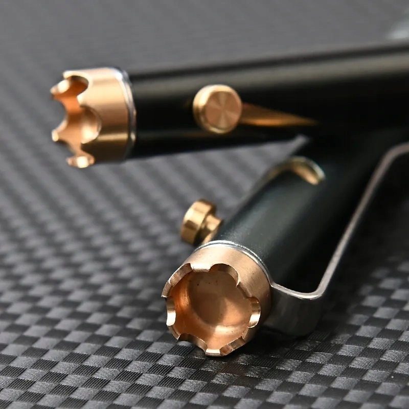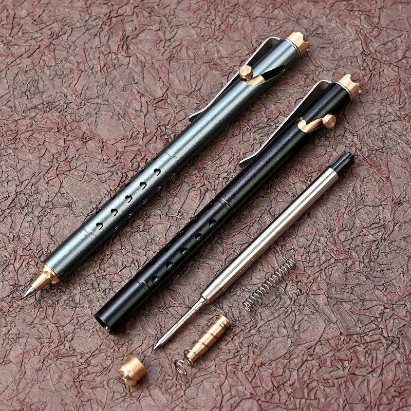 Високоякісна - елегантна - тактична ручка RELOAD CROWN HORN з алюмінієвою структурою, що забезпечує належну механічну міцність. І головка, і кінець ручки виготовлені з латунної «корони», яка в аварійній ситуації перетворює наш Crown Horn на захисний куботан. Ручка також може розбити вікно автомобіля. Завдяки компактним розмірам і сталевій кліпсі ви завжди можете мати ручку з собою - у кишені, рюкзаку чи сумці. Насічки - отвори - на корпусі покращують захоплення і полегшують роботу. Управління ручкою — це операція «затвор» — так само, як перезаряджання зброї — дуже проста й ефективна система.