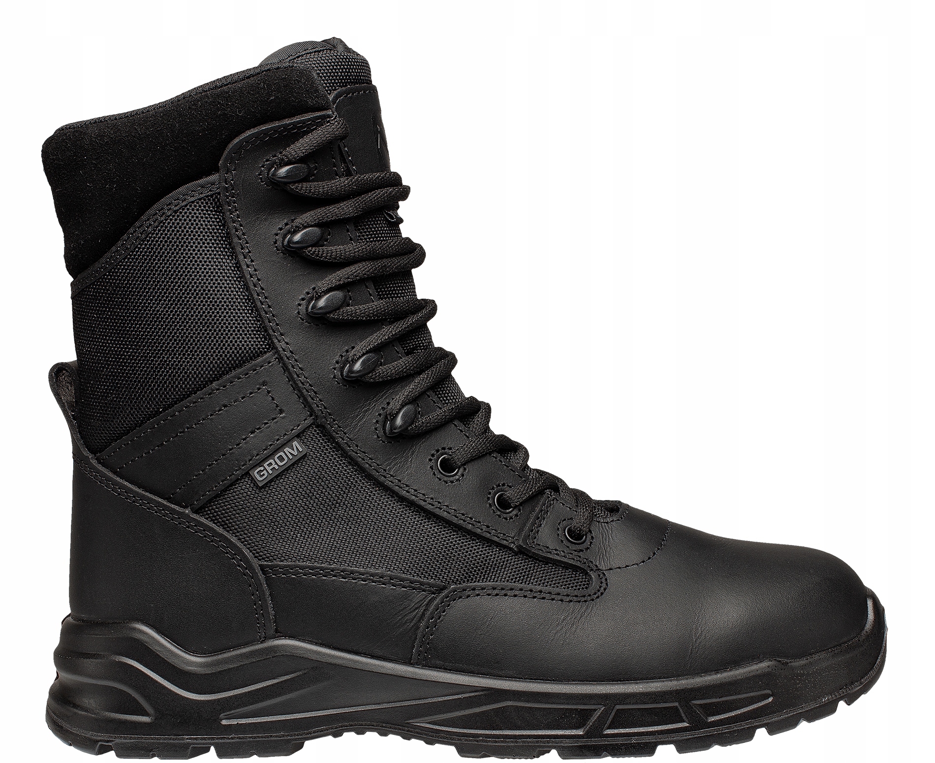 ХАРАКТЕРИСТИКИ МАТЕРІАЛУ: - гладка, чорна, повнозерниста шкіра + матеріал Cordura - Повна устілка, анатомічно профільована, замінна з високим водопоглинанням і десорбцією, антибактеріальними властивостями усунення запахів - шнурівка з 3 люверсами та 5 гачками чорного кольору - Двошарова підошва з протиковзким різьбленням і формою, що забезпечує стійкість, виконана з використанням Spartacus PU/ технологія прямого впорскування PU