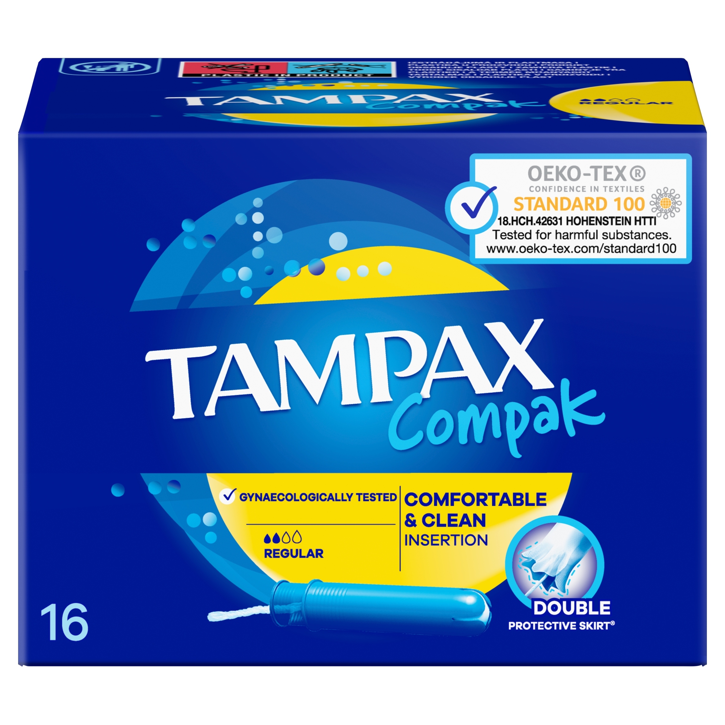 Тампони Tampax Compak Regular забезпечують захист і обережність під час легкої та середньої сильної кровотечі. Тампони Tampax Compak захищають під час менструації дуже практичним способом. Вони не містять барвників і ароматизаторів. Тампони Tampax Compak мають компактний пластиковий аплікатор із заокругленим кінчиком, що сприяє зручному застосуванню. Їх абсорбуючі канали направляють вологу прямо в тампон, а подвійна захисна оборка запобігає протіканню, тож ви можете почуватися впевнено під час менструації. Тампони Tampax Compak пройшли гінекологічні тести. Вони також пройшли незалежні перевірки на вміст шкідливих речовин і мають сертифікат Oeko-Tex Standard 100. Надійний захист від протікання, тому ви можете робити все, що забажаєте. Найкращі тампони Tampax Compak із абсорбуючою здатністю, що підходить для легкої та середньої кровотечі.