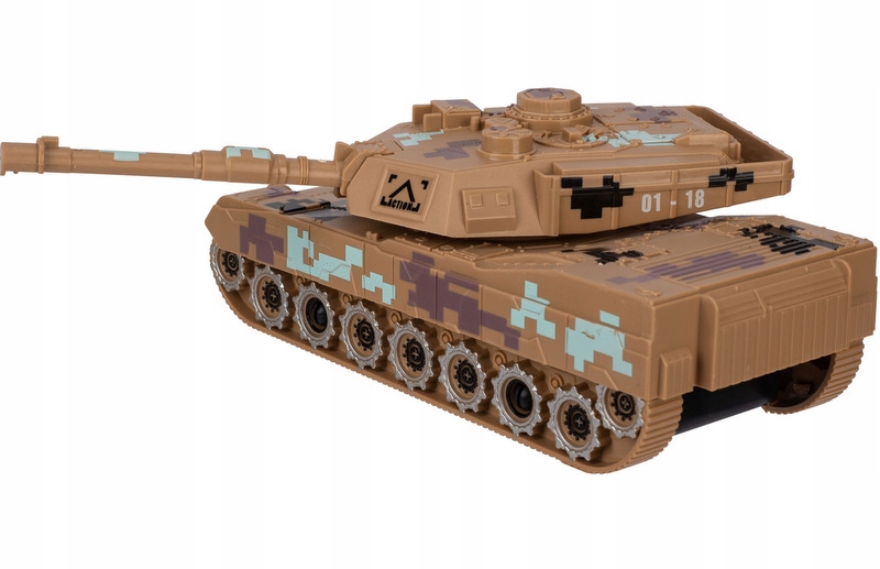 При натисканні на кнопку танк видає реалістичні звуки і вмикає світло. Крім того, іграшка має рухливу турель, що обертається на 360°.