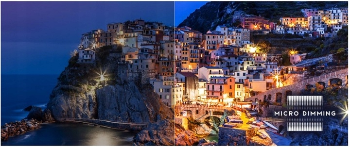 Функція мікро затемнення аналізує телевізійне зображення в тисячах окремих зон для регулювання яскравості. Якість зображення значно покращується, забезпечуючи кращий візуальний досвід, особливо в темряві.