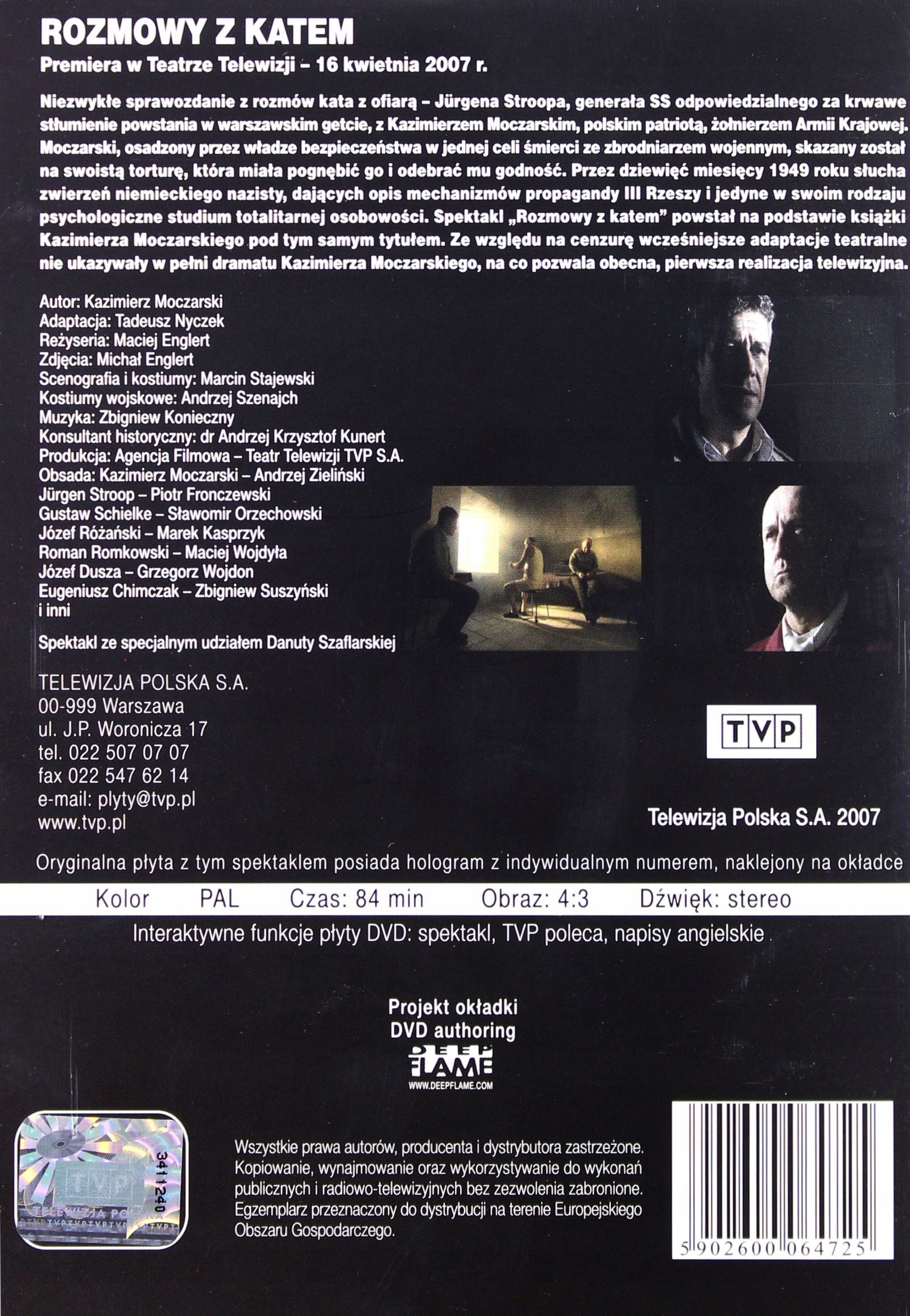 Надзвичайний звіт про розмову ката та жертви – Юргена Строопа, генерала СС, відповідального за криваве придушення повстання у Варшавському гетто, з Казімєжем Мочарським, польським патріотом і солдат Армії Крайової. Мочарський, посаджений органами безпеки в одну камеру смертників із військовим злочинцем, був засуджений до свого роду тортур, які мали принизити його та позбавити його гідності. Протягом дев’яти місяців 1949 року він слухає зізнання німецького нациста, описуючи механізми пропаганди Третього рейху та унікальне психологічне дослідження тоталітарної особистості. Вистава «Розмови з катом» поставлена за однойменною книгою Казімєжа Мочарського. Через цензуру попередні театральні адаптації не повністю представляли драму Казімєжа Мочарського, що дозволено поточною, першою телевізійною постановкою.