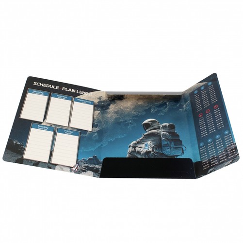 - Внутрішня частина папки оснащений планом уроку, таблицею множення або інформацією про неправильні дієслова, що робить його ще більш функціональним.