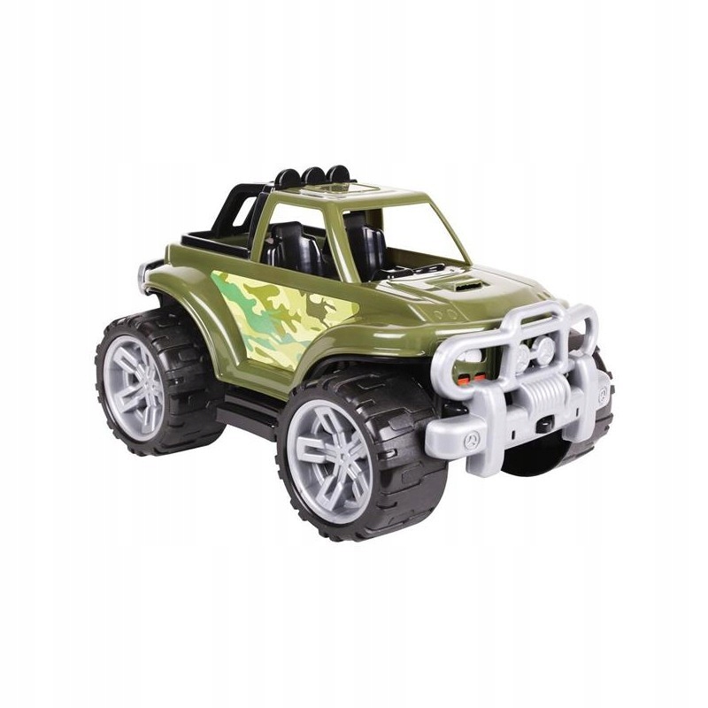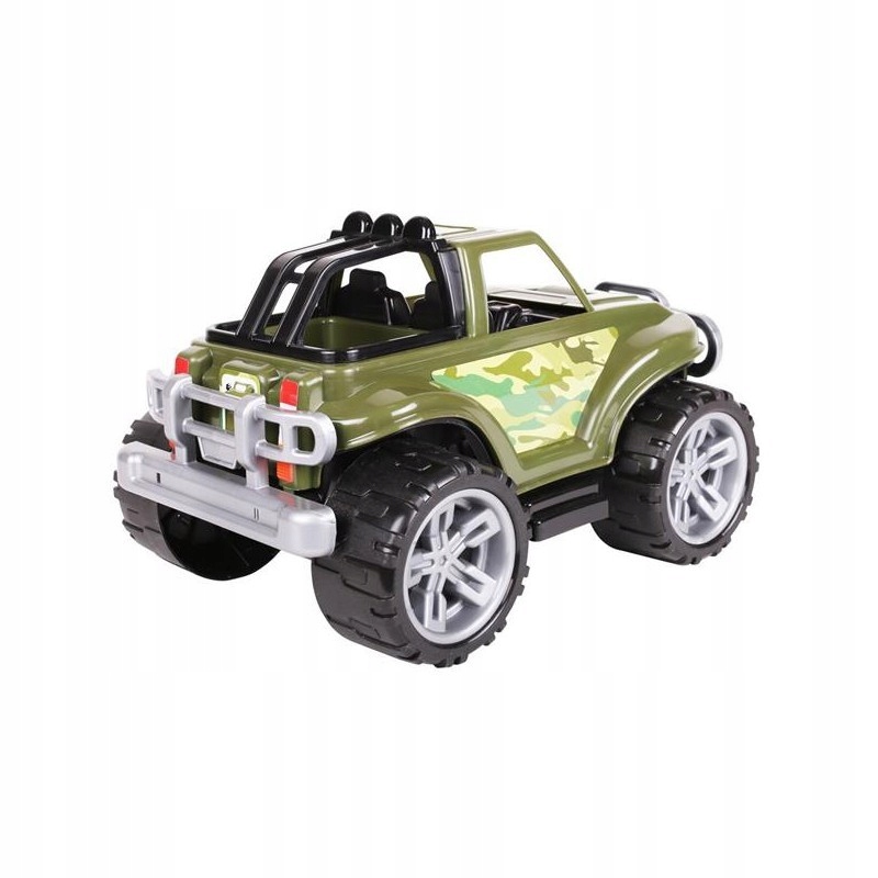 Автомобіль має відкритий кузов і масивні бампери (кенгуру), також він оснащений великими колесами з протектором, які легко долають різні перешкоди. Цікавий зовнішній вигляд, кольори автомобіля та наклейки відображають справжню модель Jeep.