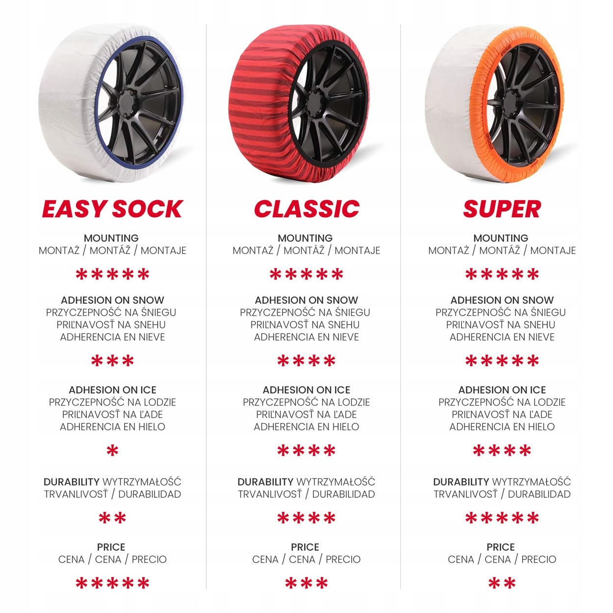 Велика модель характеризує кращу міцність продукту для використання на асфальті, покритому таполозковою грязюкою. Класичний та легкий серіал шкарпетки, як правило, планується для снігу та льоду.