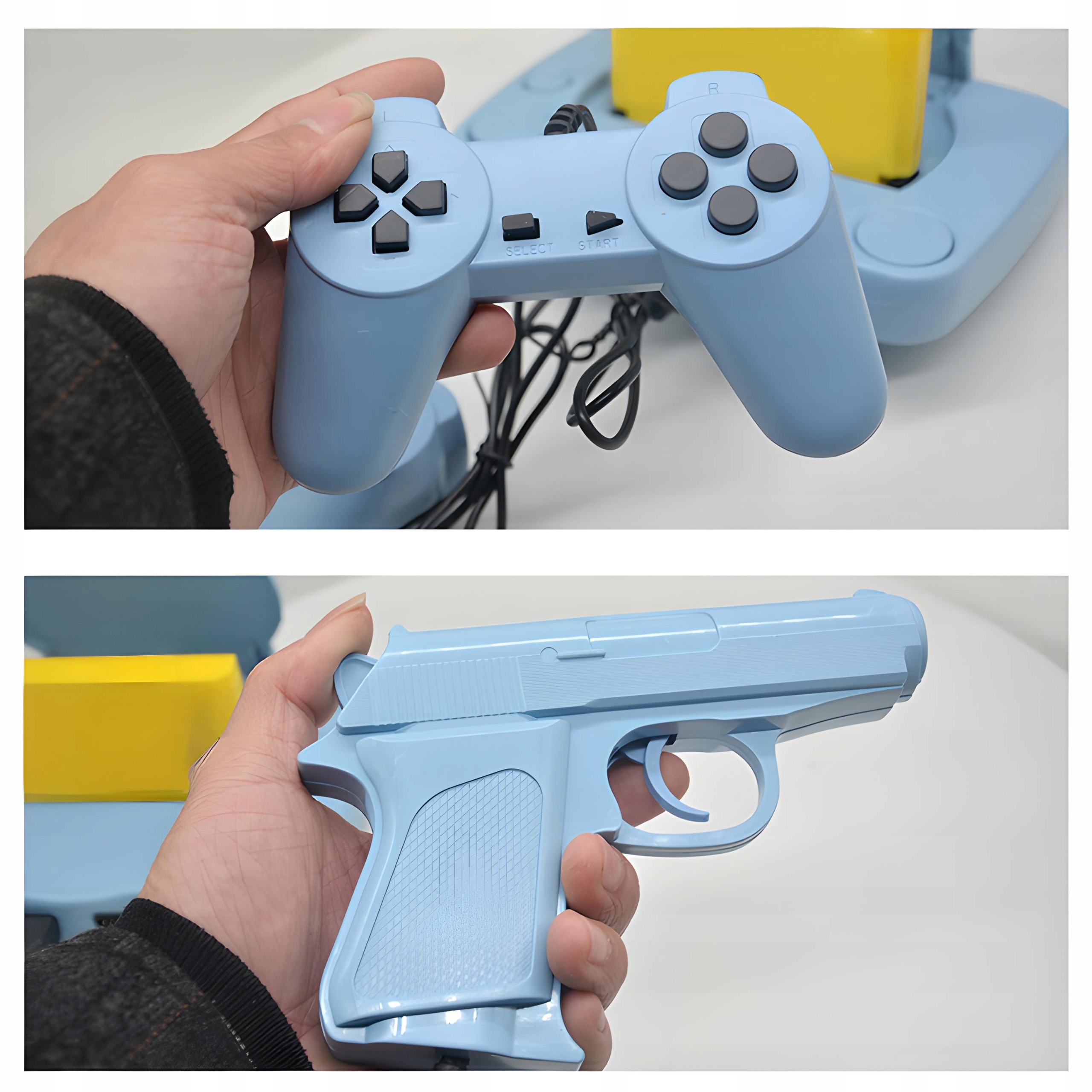 ✔ 8-бітна консоль відеоігор у наборі з двома прокладками та пістолетом, що дозволяє разом і конкурувати разом.