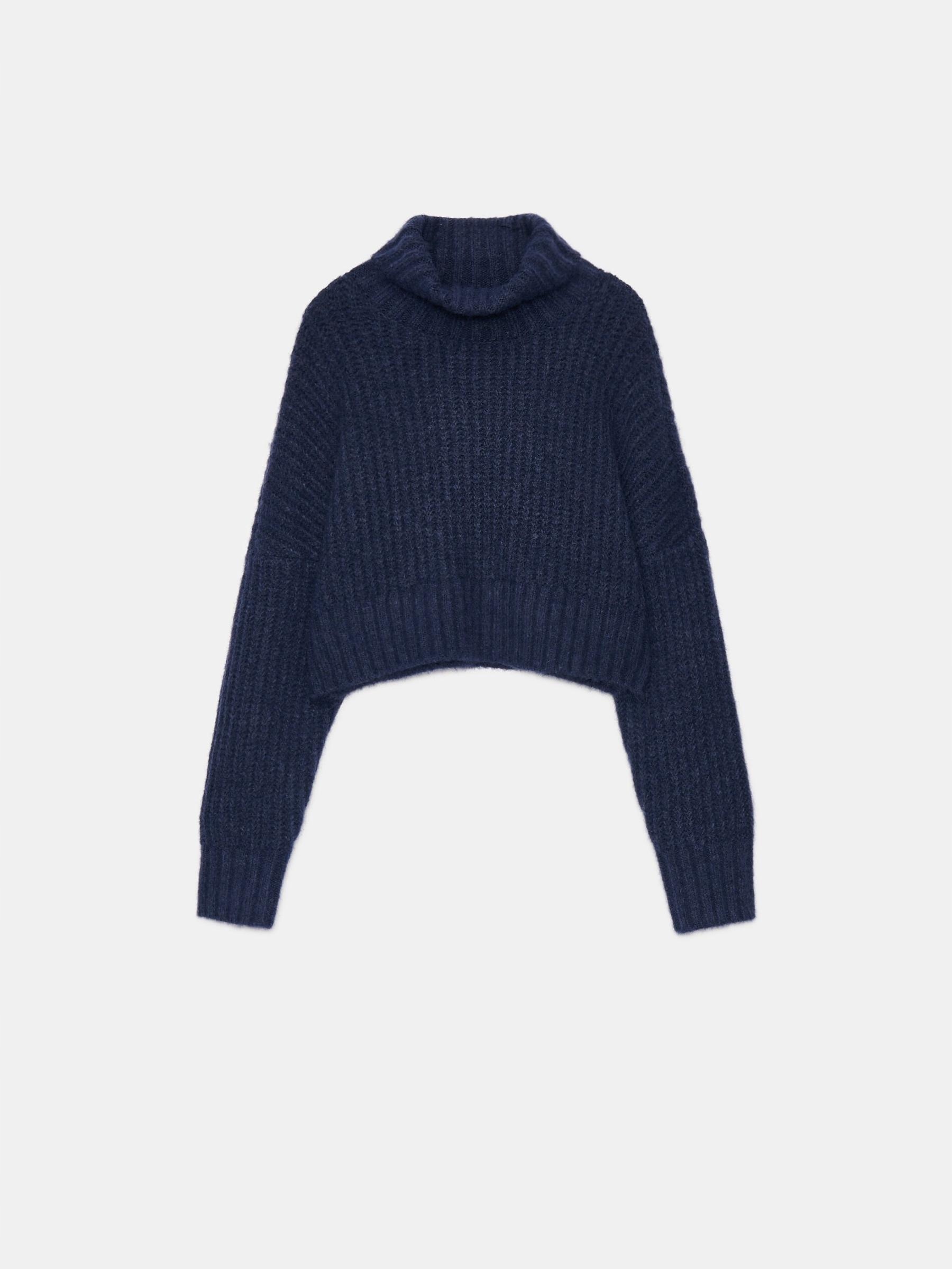 ТЕМНО-СИНІЙ КОРОТКИЙ В'ЯЗАНИЙ СВЕТР НА ТУПЛАНІ З ДРАХОМ ВОВНИ MOHITO M