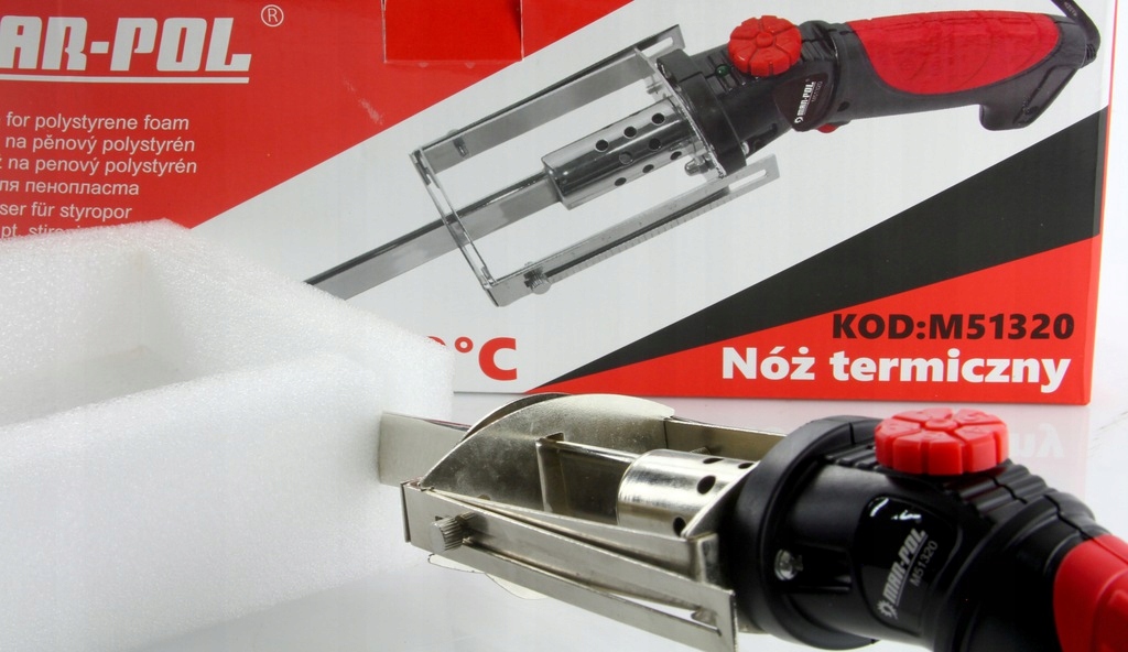 Термоніж марки MAR-POL використовується для різання елементів з полімерів: PP, PVC та EPS. Пристрій має 5-ступеневе налаштування температури. Повзунок дозволяє регулювати робочу довжину леза.