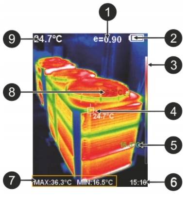 Камера чітко та інтуїтивно зрозуміло відображає розподіл температури в області, записаній інфрачервоним об’єктивом. Різниця температур відображається за допомогою широкої кольорової палітри на вбудованому екрані.