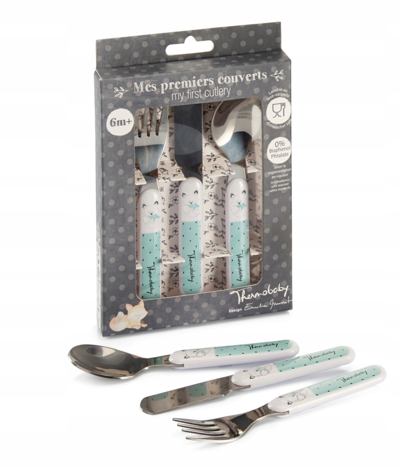 Столові прибори можна придбати разом із тарілкою з відділеннями або столовим набором із таким же мотивом.