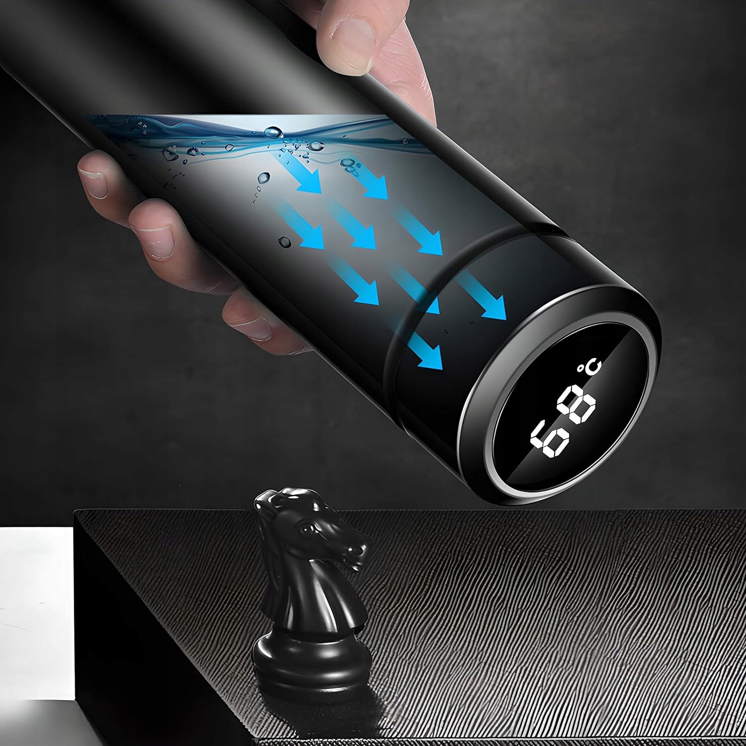 Термос оснащений сучасним сенсорним LCD дисплеєм з вбудованим температурним індикатор. Досить лише одного дотику, щоб екран ожив і показав поточну температуру рідини всередині. Крім світлодіодного індикатора температуриу вигляді цифрLCD, на екрані є символ краплі - він змінює колір в залежності від температури напою всередині. Для холодних напоїв крапля синя, а для гарячих — червона.
