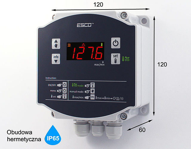 Лічильник розроблено в промисловому герметичному корпусі IP65 для роботи в складних умовах. Він стійкий до бруду, високої концентрації вологості та низьких температур. У комплект входить три термодатчика з нержавіючої сталі з кабелем 2 м. Він доступний у трьох версіях джерела живлення: стандартна – 230 В змінного струму, варіанти – 12 В змінного струму/постійного струму та 24 В змінного струму/постійного струму (доплата 12 В – 12,30 злотих, 24 В – 36,90 злотих)