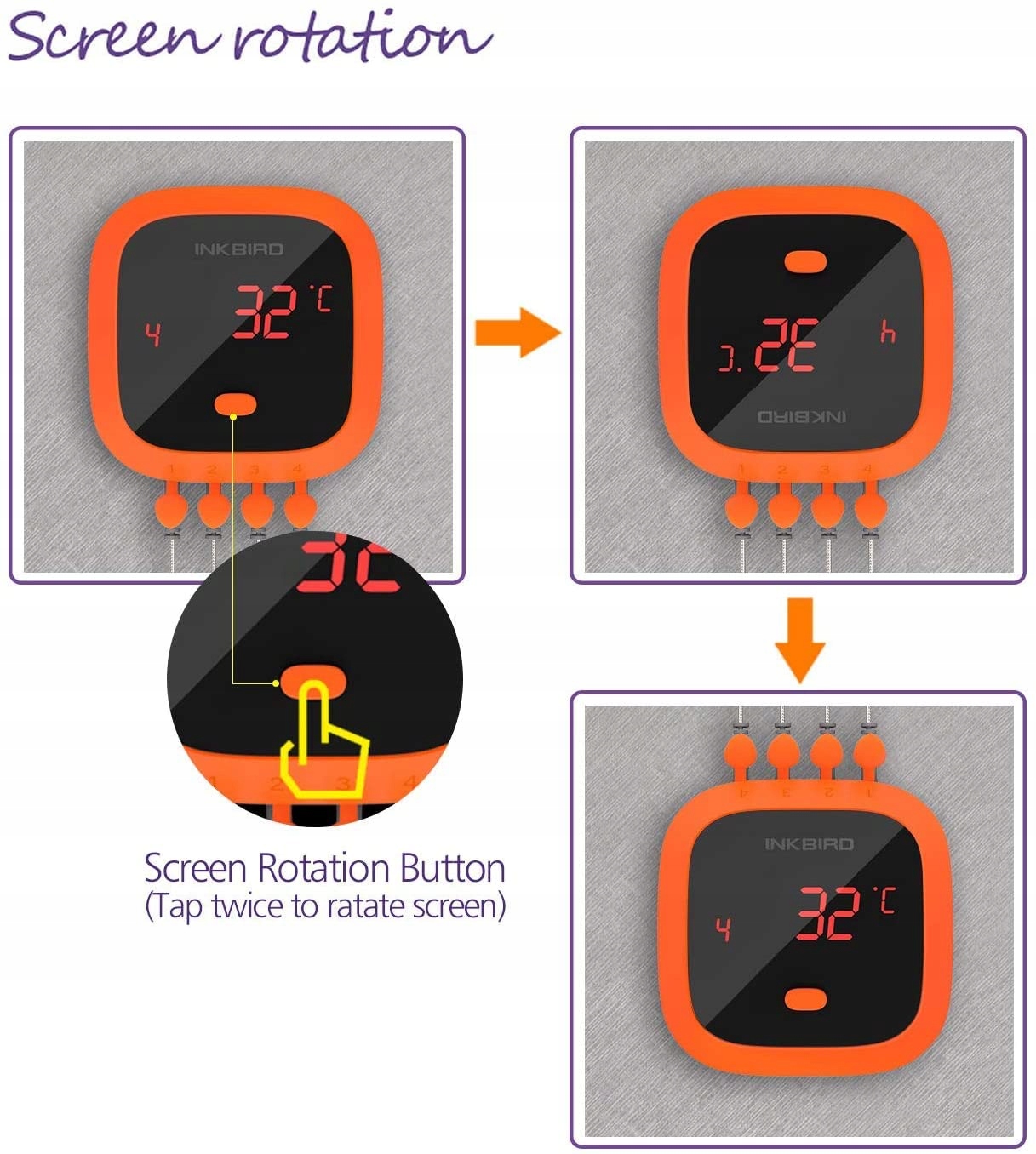 Гуманізована магнітна конструкція: b> Конструкція магнітної дошки дозволяє прикріпити індикатор внутрішньої температури до печей, бочок, курців або інших металевих виробів поблизу. Напрямок світлодіодного дисплея можна змінити, натиснувши кнопку двічі.