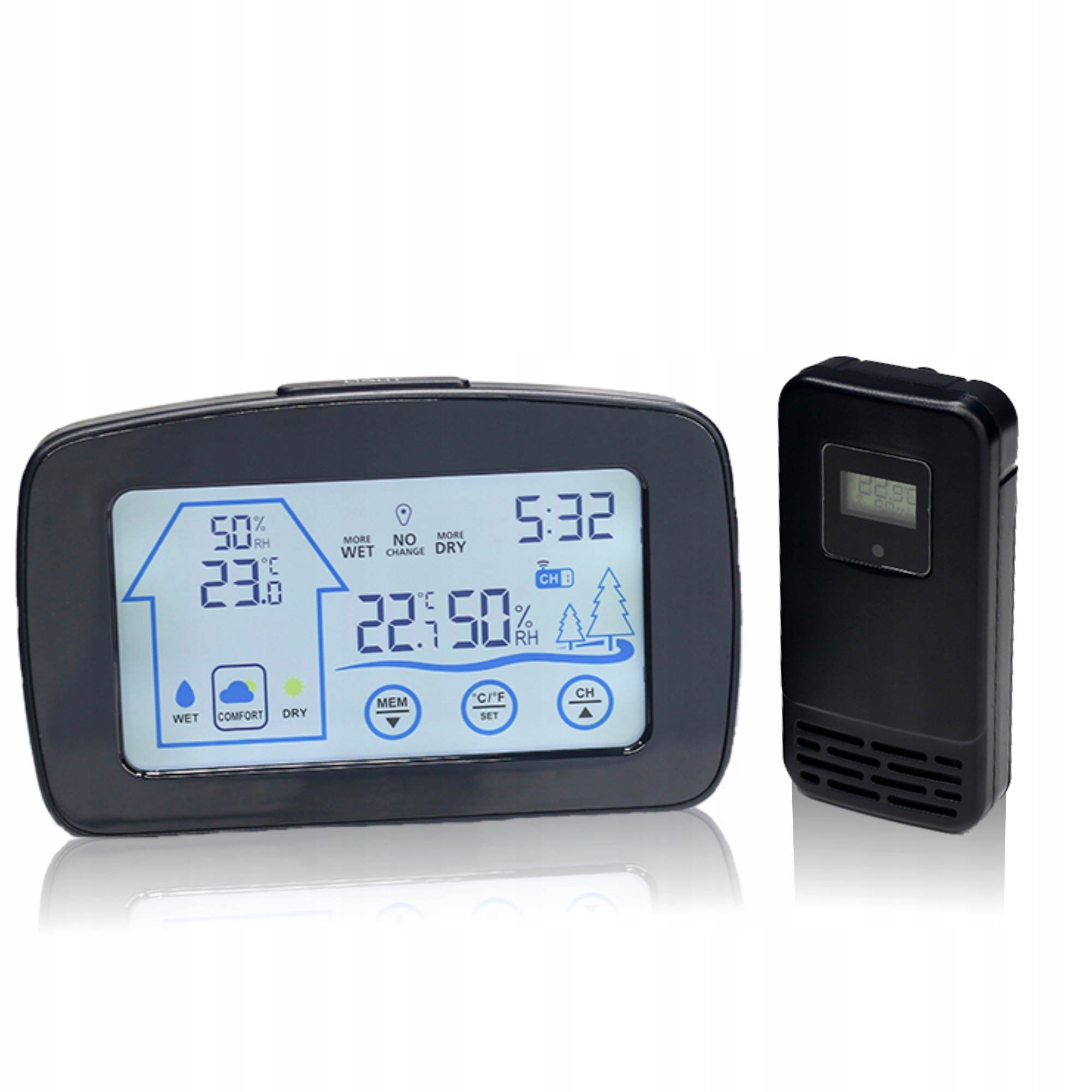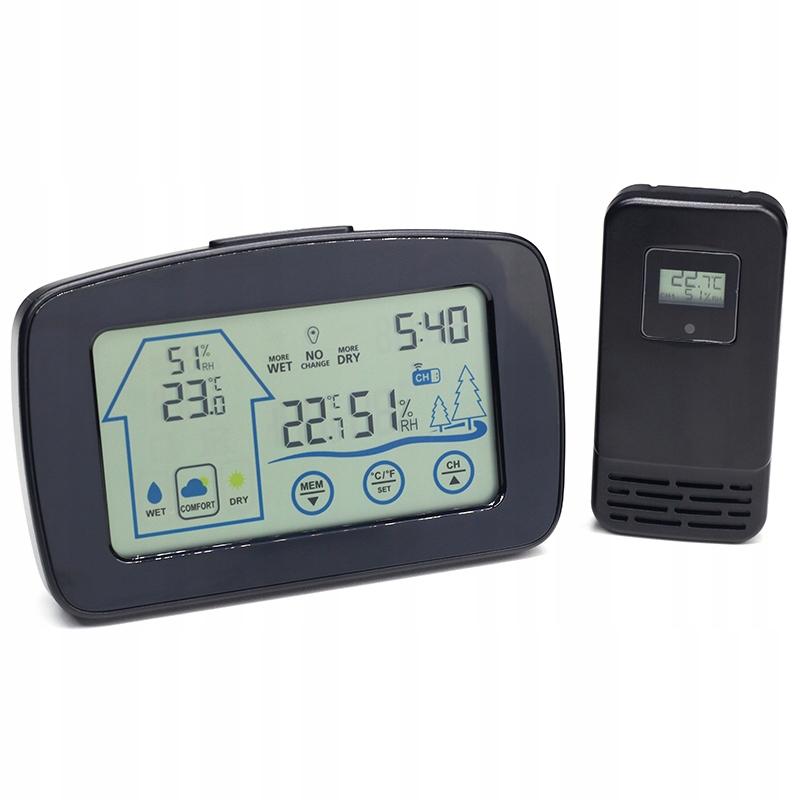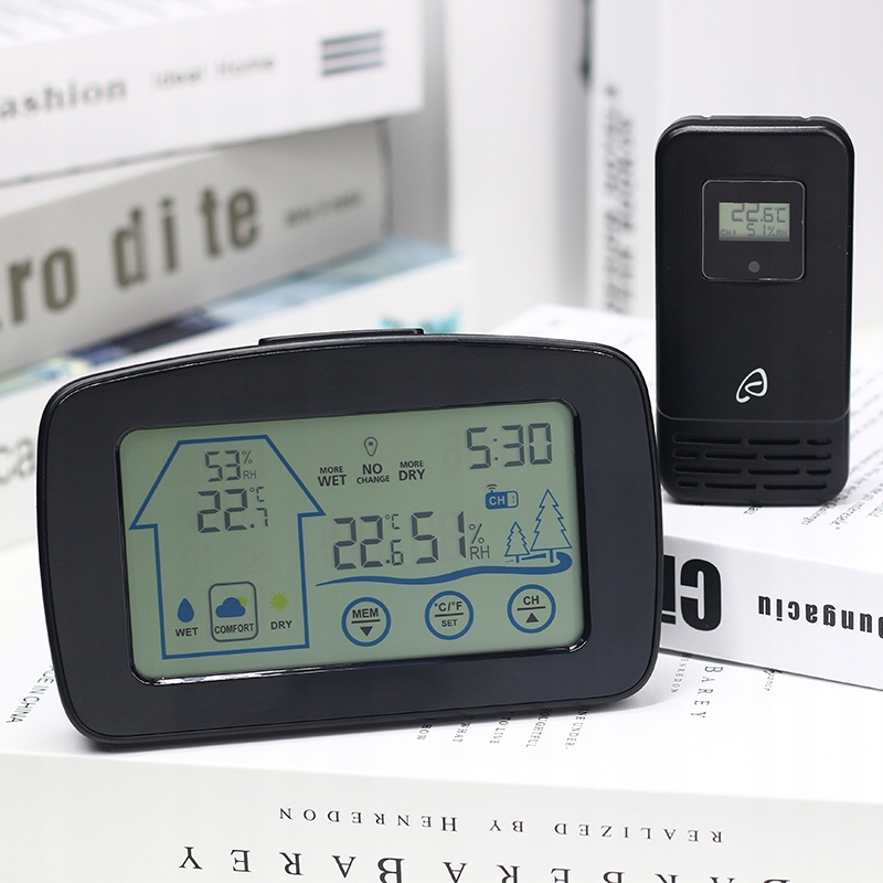 Цей пристрій показує температуру та вологість у приміщенні та на вулиці. Він також відображаєчасі вказує накомфорту кімнаті (розраховується на основі вологості).