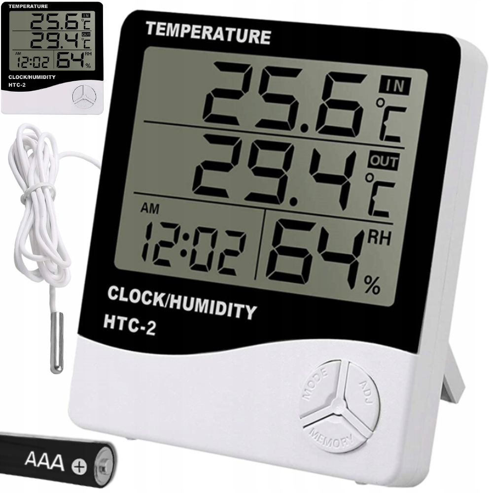 Електронний кімнатний термометр з гігрометром і зовнішнім щупом - сучасний прилад, призначений для контролю температури і вологості повітря. Завдяки включеному дротовому зонду можна вимірювати як внутрішню, так і зовнішню температуру, що робить її універсальною міні-метеостанцією. Чіткий РК-дисплей відображає кілька значень одночасно: температуру, вологість, час і налаштування будильника.