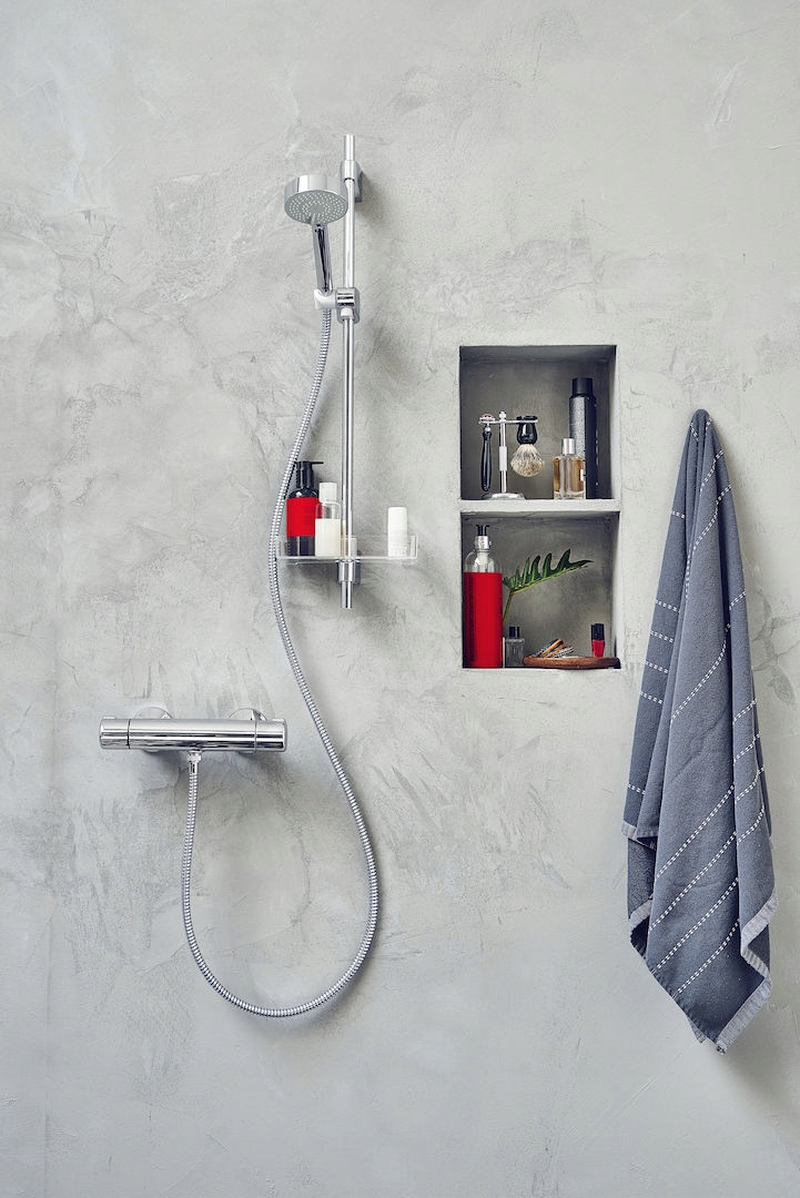 Термостатичний змішувач для душу. Включає ексцентрики та розетки. Регулятор температури оснащений обмежувачем на 38°C. Екологічний контроль стоку води. Змішувач містить сітчасті фільтри та зворотні клапани.